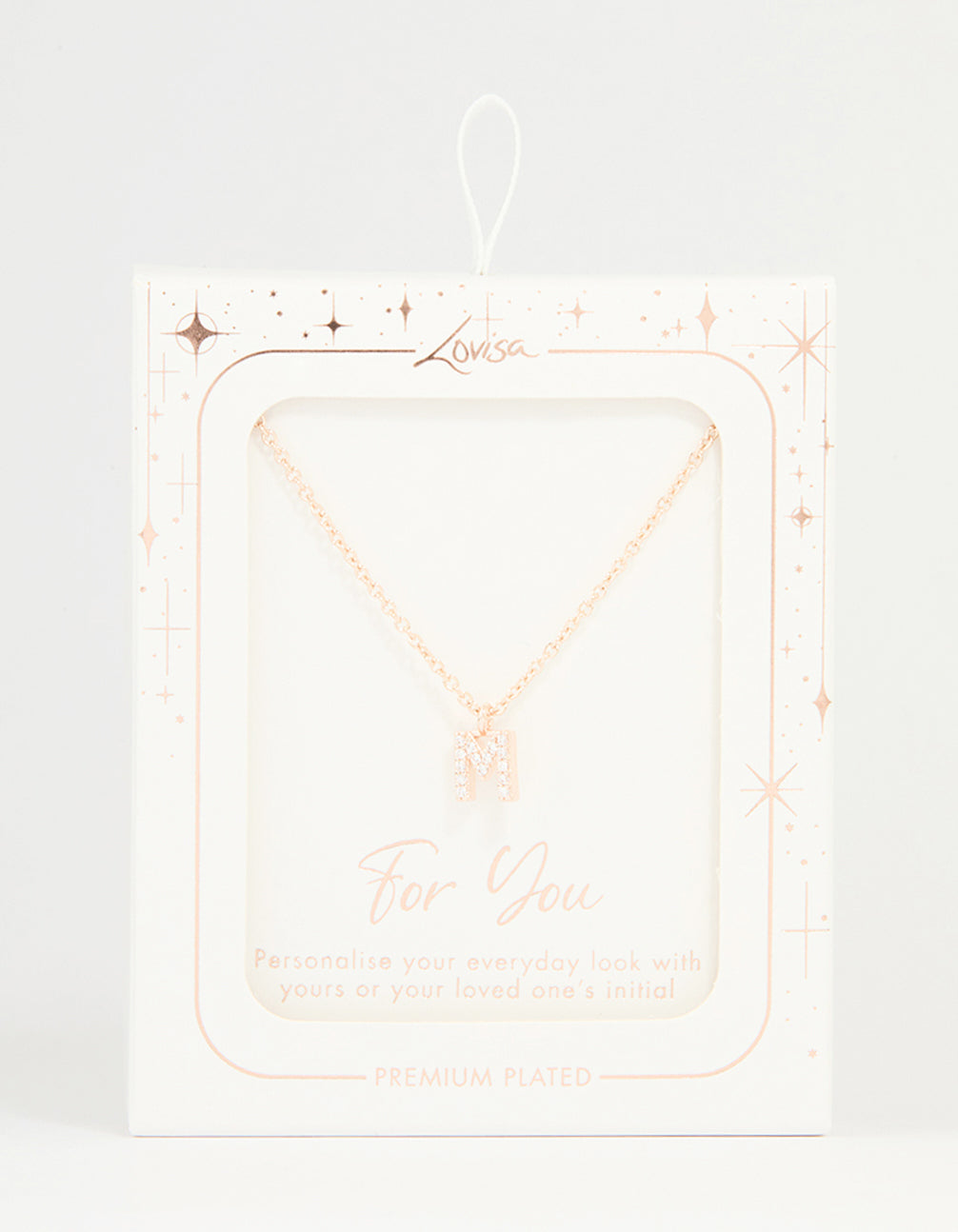 Add a personal touch to your look with the Rose Gold Plated Cubic Zirconia Letter M Necklace. This elegant pendant necklace features a chic letter M design in rose gold plating, complemented by sparkling cubic zirconia crystals for a modern yet timeless finish. Perfect for layering or wearing solo, it's a versatile piece that works beautifully with casual outfits or dressy ensembles. Whether you're accessorising for brunch, a night out, or even the office, this necklace adds a dash of personality and sophistication. A thoughtful gift or a treat for yourself, it's ideal for anyone who loves stylish, meaningful jewellery. Perfect for showcasing your initial or for someone special who has this initial.