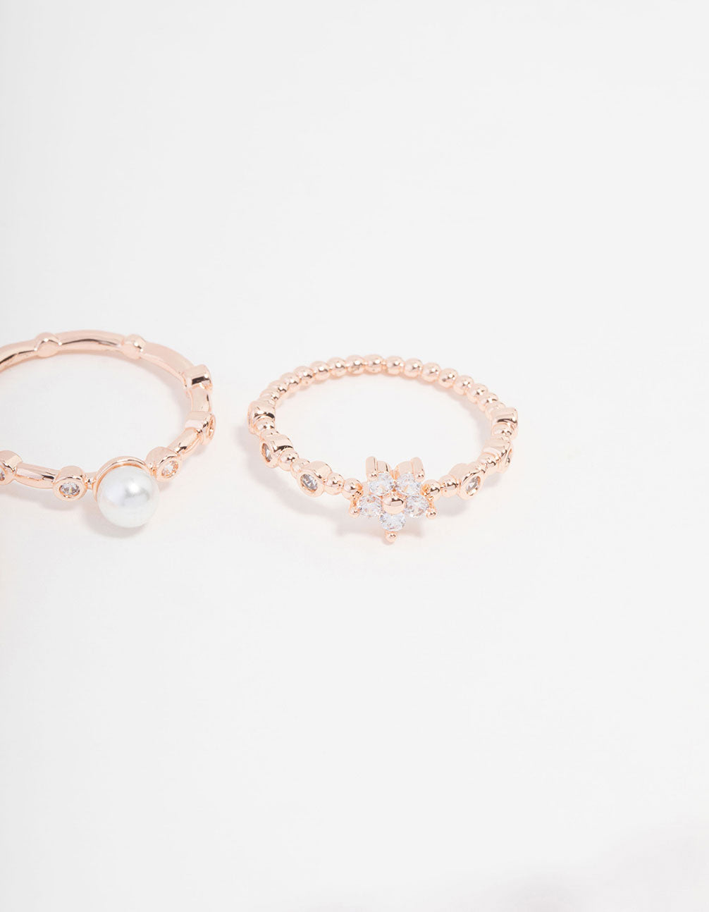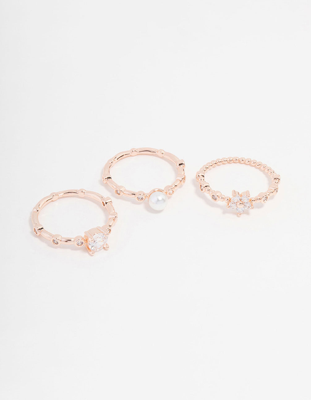 Wear this trio of Rose Gold Plated Rings stacked together for a cool contemporary look, or individually to make a subtle statement. Featuring Cubic Zirconia and Pearl accents for a chic effect.