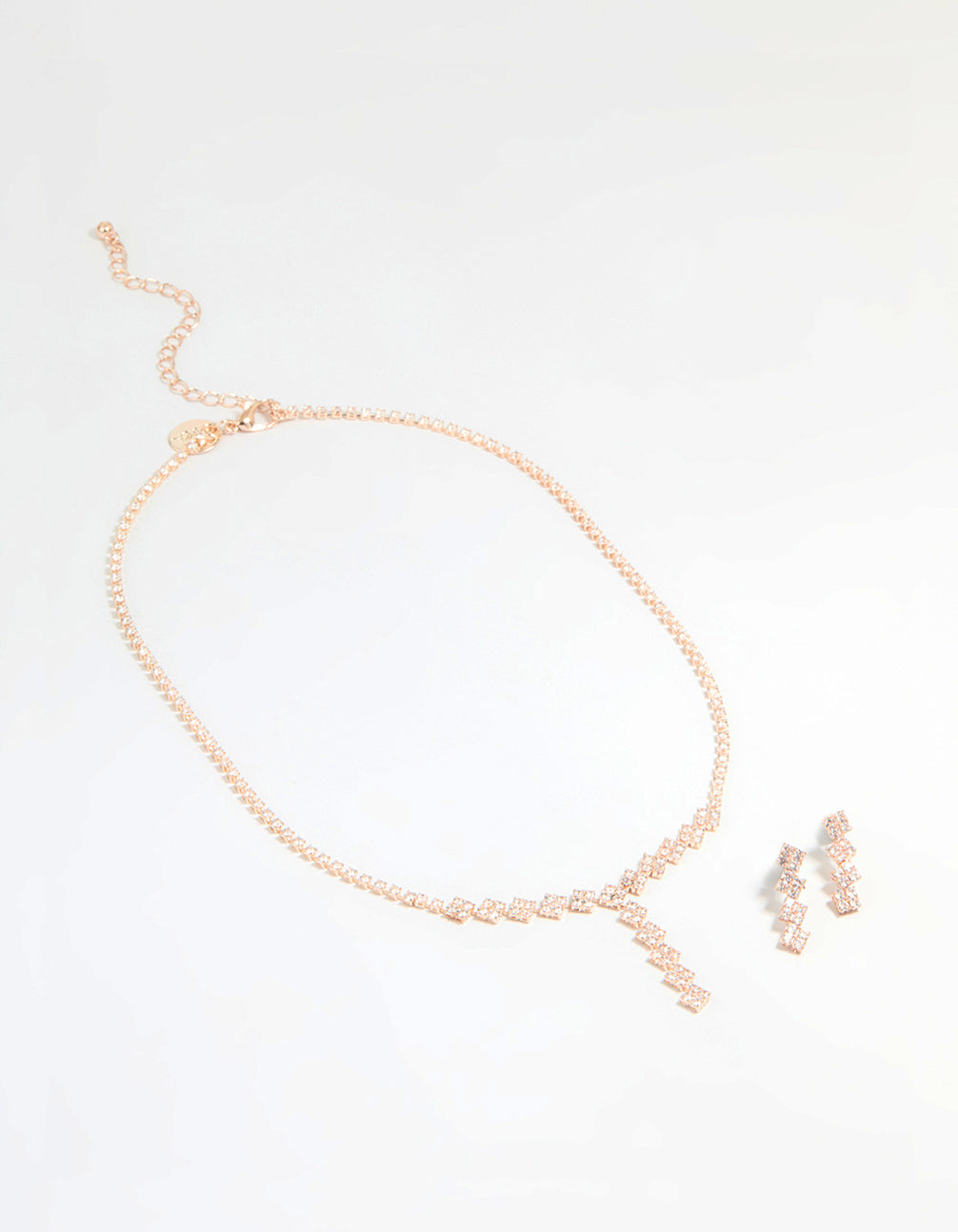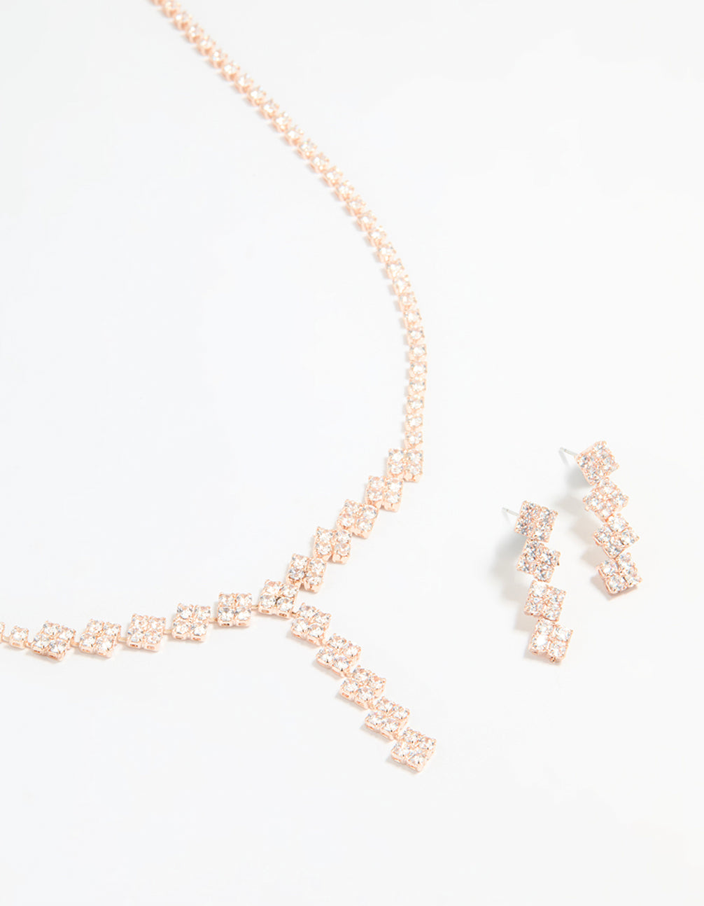 Rose Gold Plated Cubic Zirconia Square Drop Necklace & Earrings Set