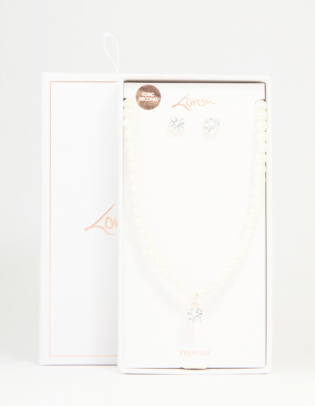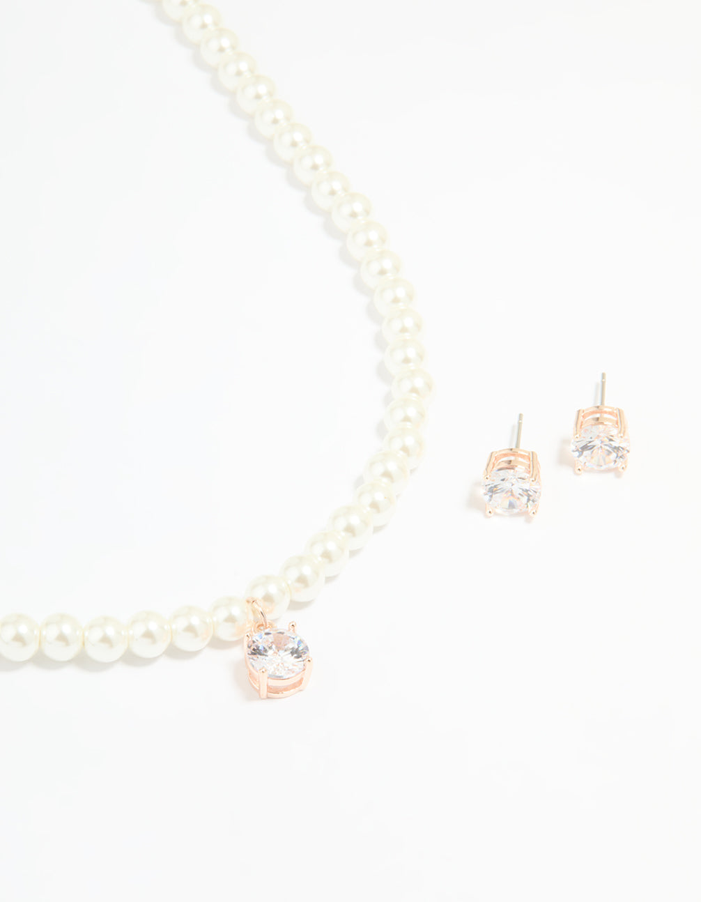 Rose Gold Plated Pearl & Cubic Zirconia Drop Necklace & Earrings Set