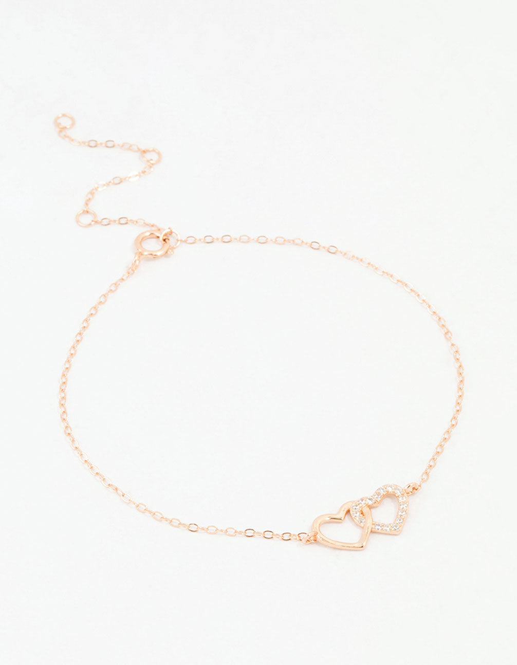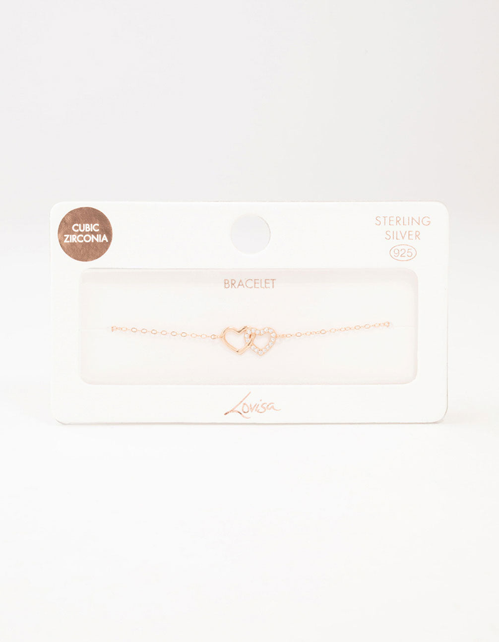 Double the love with this sleek bracelet! Featuring a rose gold-plated sterling silver base and two linked hearts, it's like wearing a hug on your wrist.