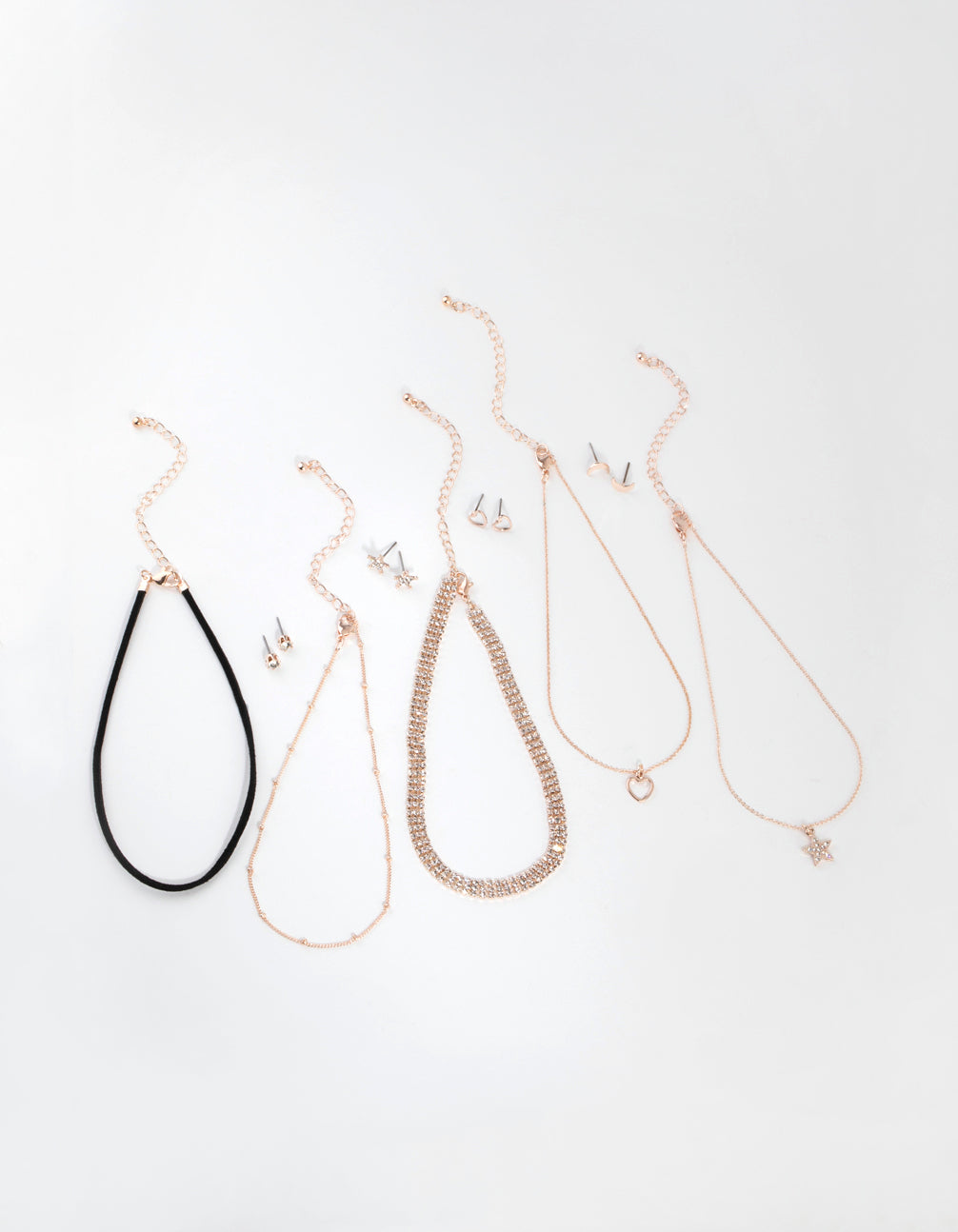 Mix them, match them, stack them! This pack includes five pairs of chokers and five pairs of stud earrings. Each boasts a different design, which makes them perfect for layering. Get creative!