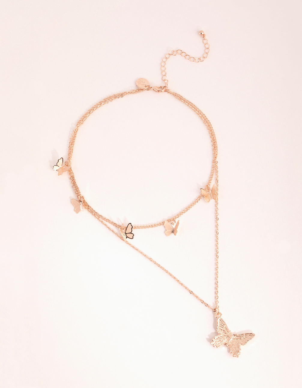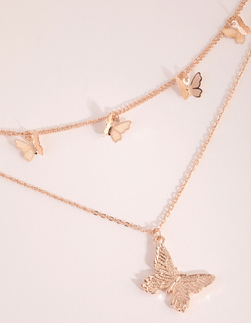 This beautiful rose-gold-toned necklace will give you butterflies! It features two tiered rows to create a layered effect. The first row features a row of dainty butterfly charms, and the second row features a larger butterfly pendant. So cute!