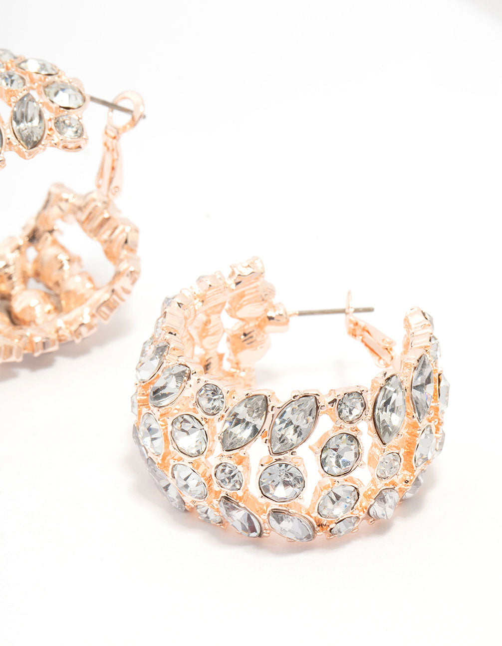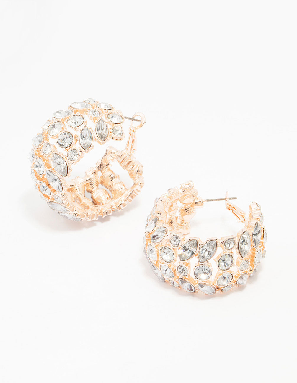 For a romantic touch to your stack, style these rose gold hoop earrings. These decorative hoops feature a wide silhouette, adorned with mini diamantes for a touch of glamour.