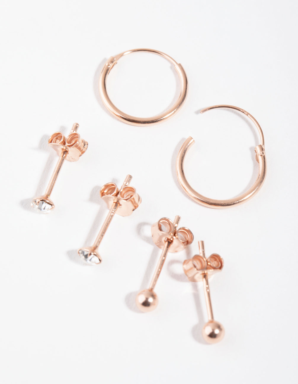 Invest in some quality basics that are perfect for everyday wear. These earrings are plated with genuine gold, and are made from sterling silver so they're gentle on ears. This pack includes three pairs of rose gold earrings: two pairs of ball studs and a pair of sleeper hoops. Stack them with statement pieces in a curated ear for maximum impact!