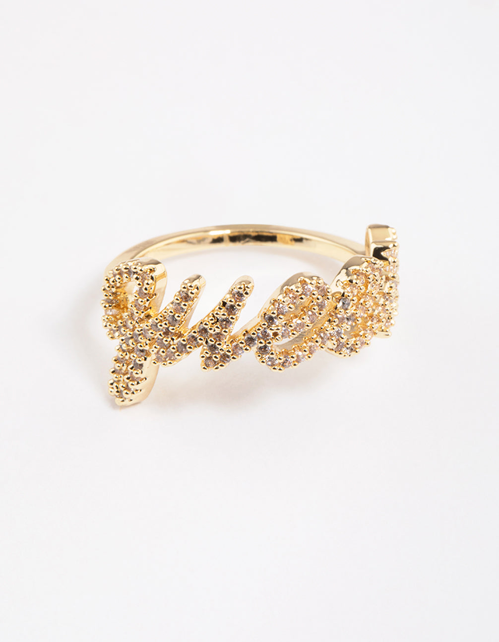 • Crafted from genuine gold and delicate cubic zirconia crystals, this script ring can serve as a reminder in your daily stack to act like royalty. Discover our collection of bestselling rings from our Gold Plated Collection and curate a signature, layered look.