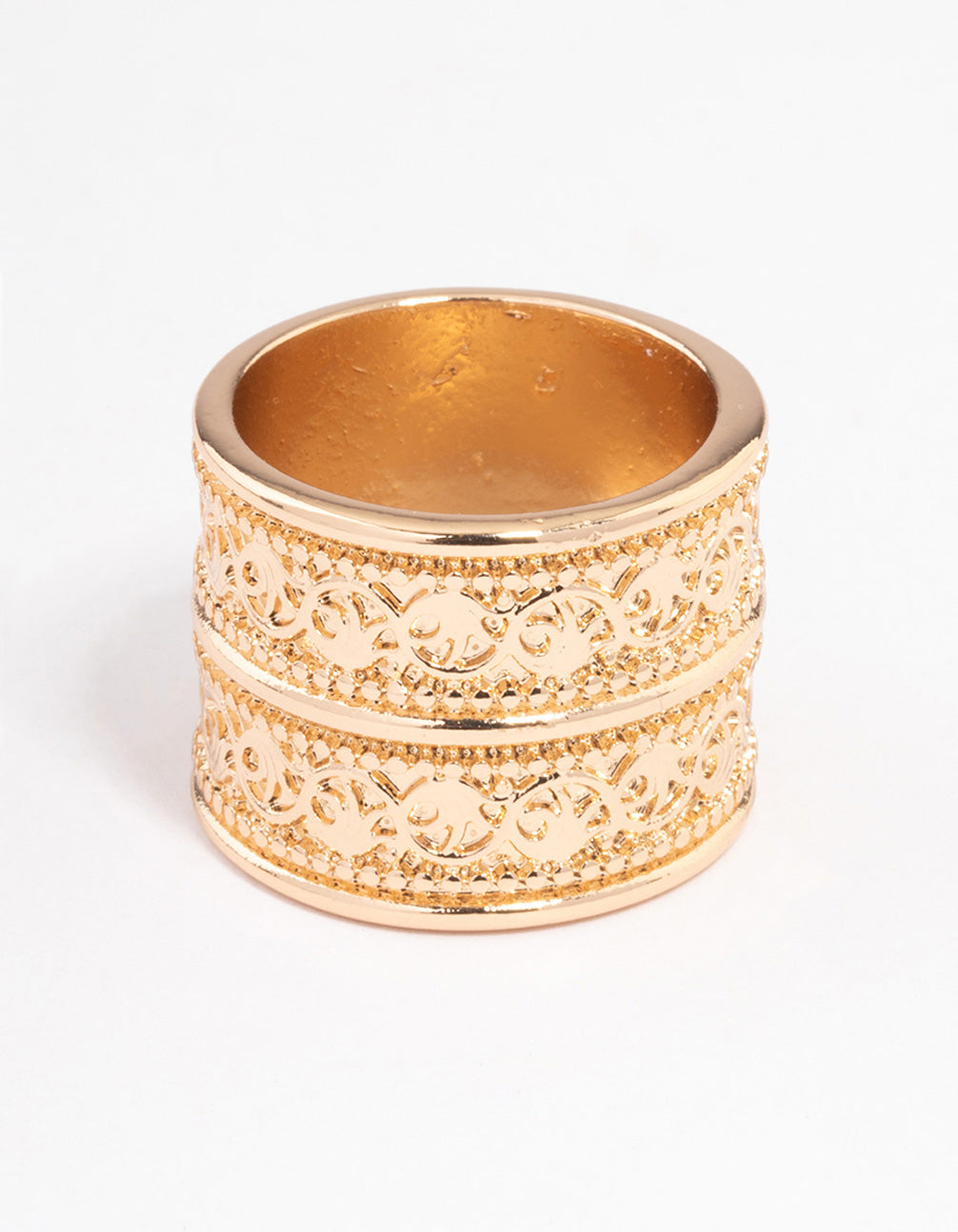 - This gold-toned ring features an intricate, filigree texture for a unique finish. Style this piece with accessories from our Gold Essentials Collection for the ultimate pairings.