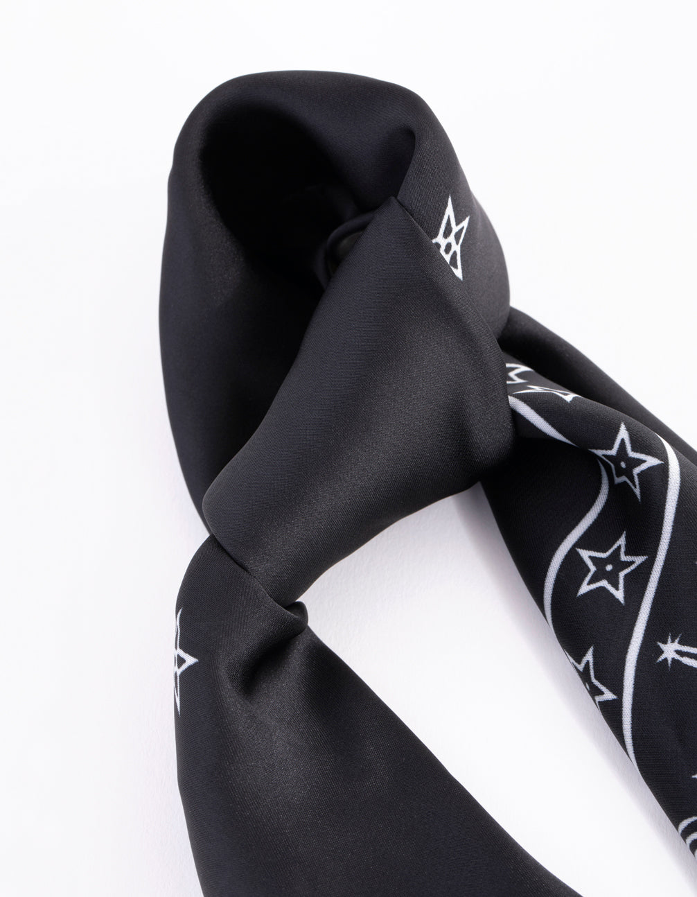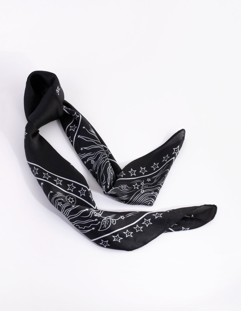Scarves are fun accessories which can be worn around your neck, in your hair, or attached to other accessories - so versatile! This lovely scarf is black, and features a tarot-inspired celestial design.
