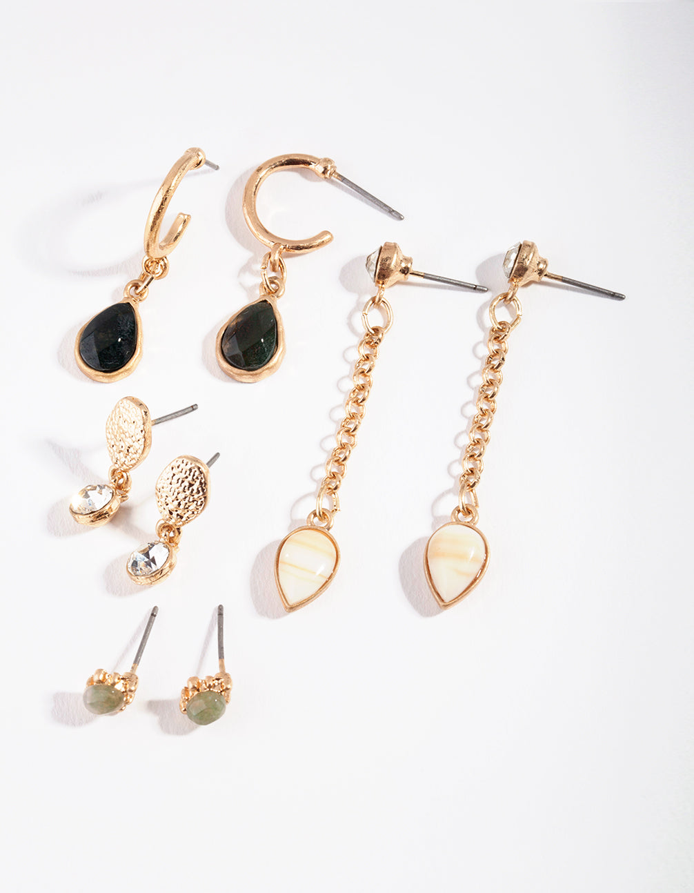 Discover the Semi Precious collection, featuring curated jewellery with semi-precious stone elements made to balance and restore. Change up your ear game with this stunning earring set, which features four pairs of gorgeous gold-toned earrings with green, cream and black semi-precious stones.