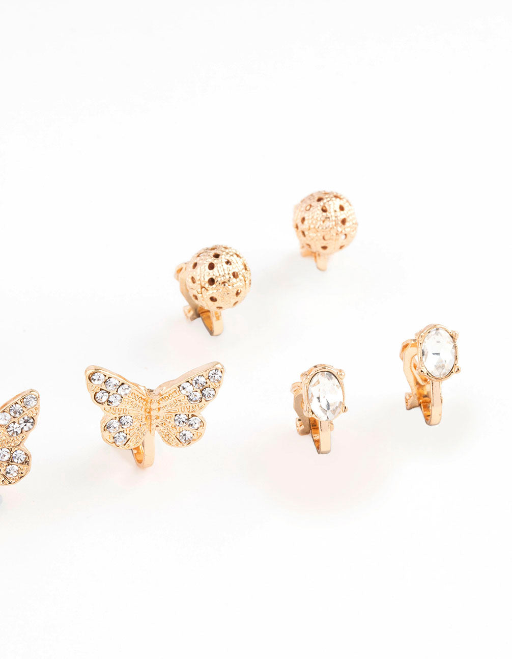 • This earring pack contains 12 pairs of gold clip on earrings adorned with a collection of diamantes and butterfly motifs.