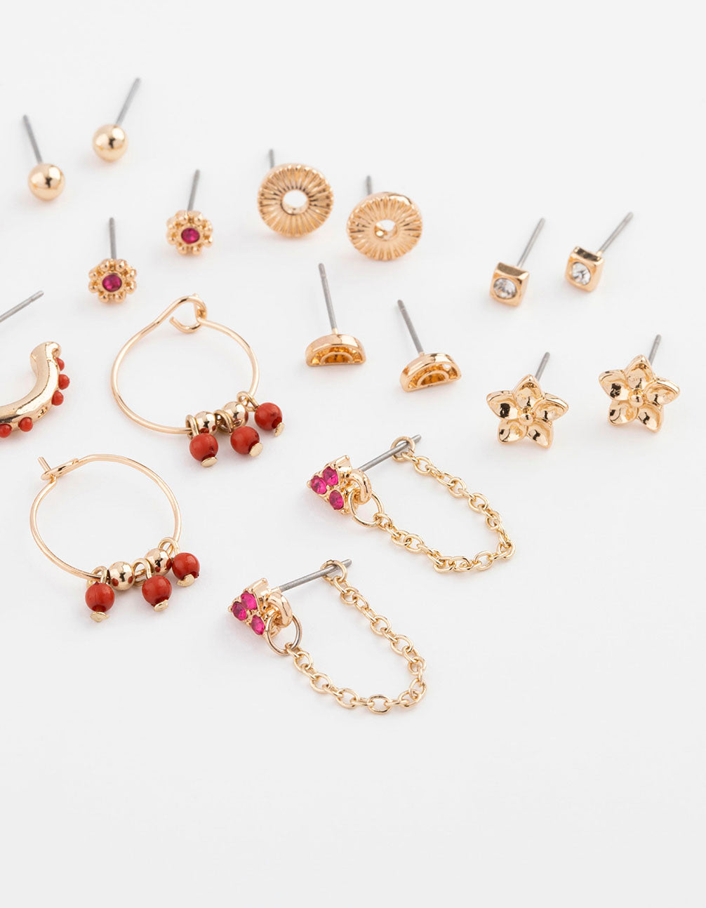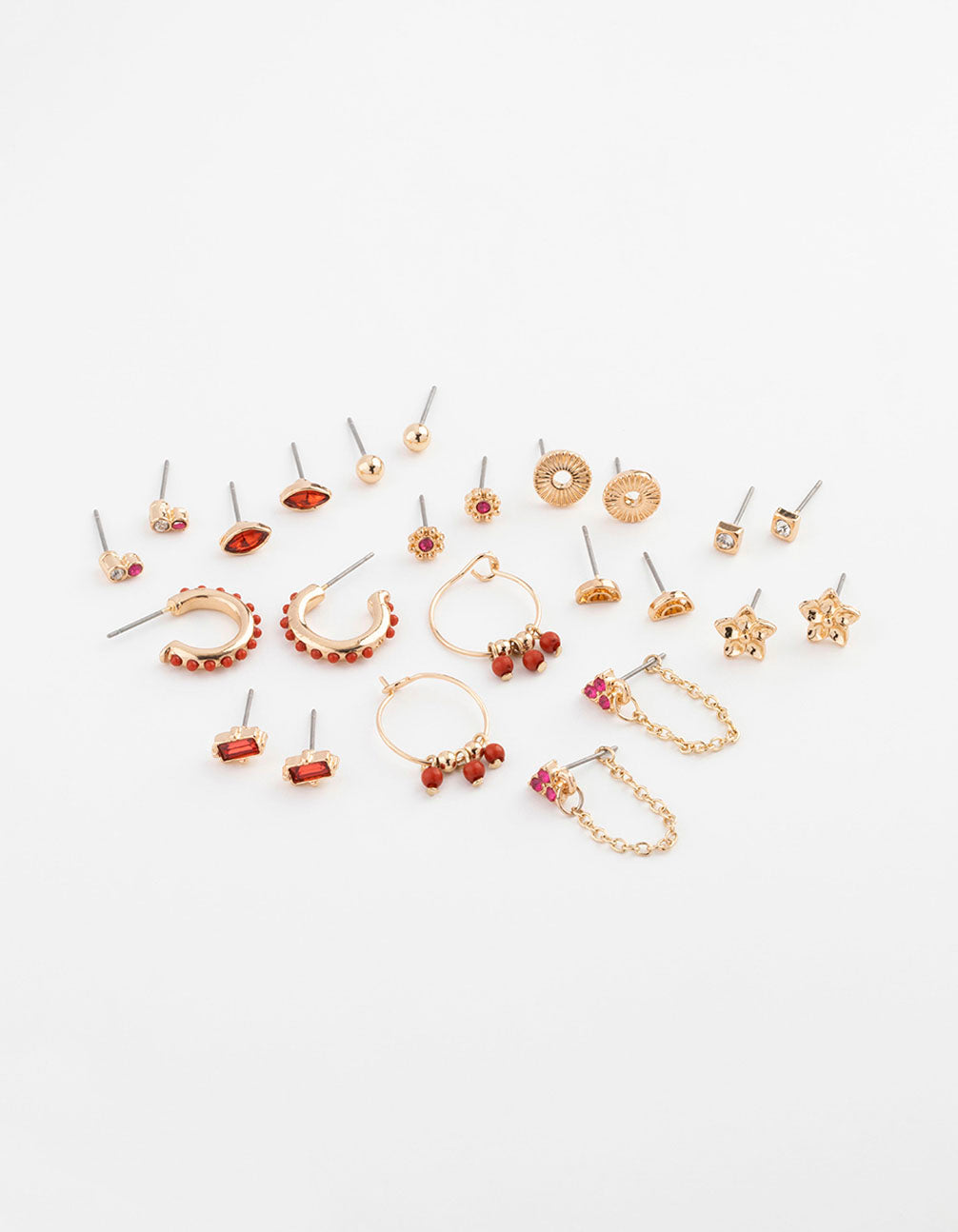 - This earring pack contains 12 pairs of gold hoop and stud earrings adorned with a collection of rainbow diamantes.