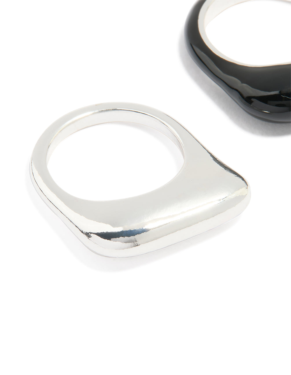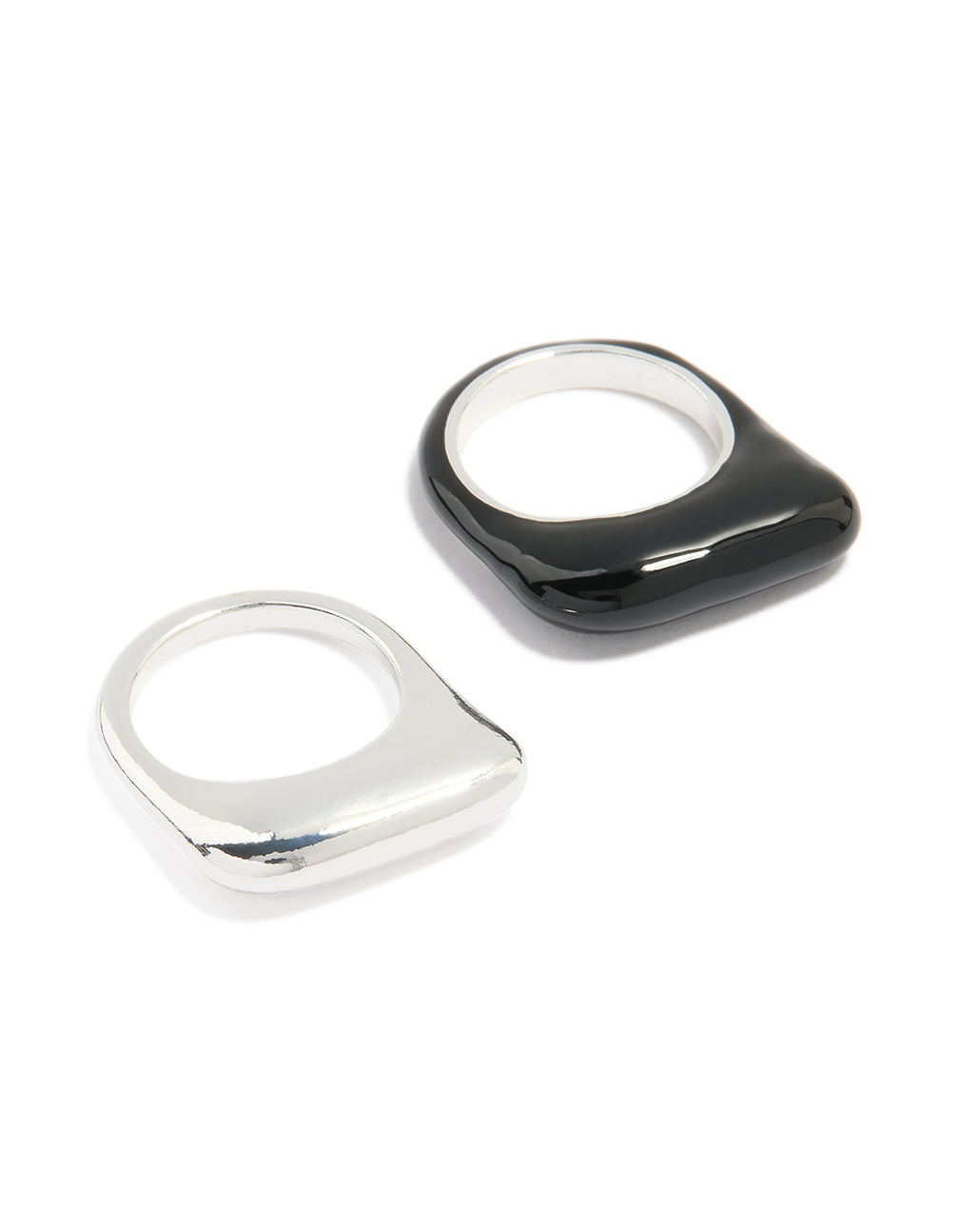 Elevate your accessory game with this Silver & Black Rectangle Bar Rings Pack. This stylish ring set features two sleek stacking ring, one with a chic silver bar front and another with a striking black bar design. Perfect for mixing and matching, these minimalist rings add a modern edge to any outfit. Whether you're dressing up for a dinner date or keeping it cool and casual for brunch with friends, these versatile rectangle rings are your go-to. Wear them stacked for a bold statement, or style them solo for a refined, understated look. Pair with monochrome outfits or metallic accents for a coordinated vibe.
