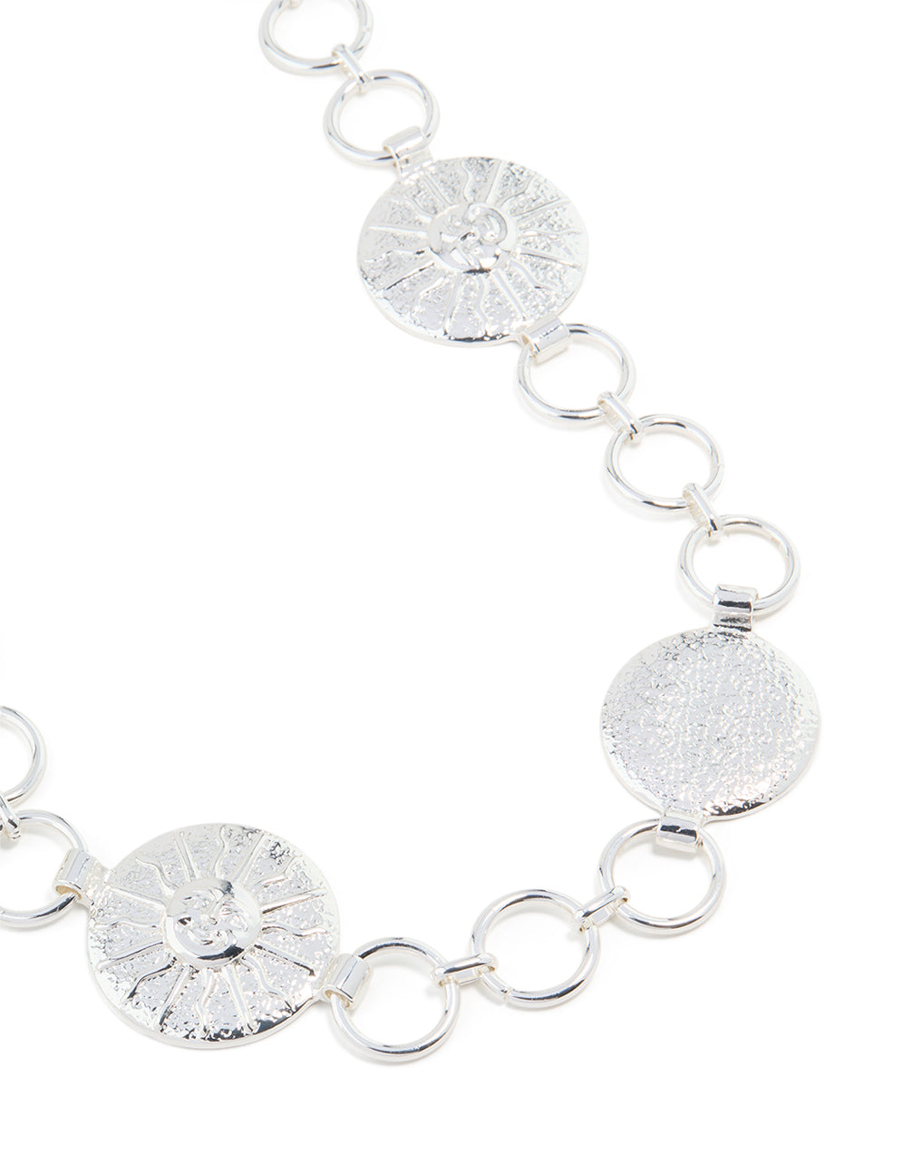 Add a touch of celestial charm to your outfits with this Silver Celestial Sun Linked Belt. Featuring an intricate chain design with sun-shaped links in a sleek silver finish, this accessory is both stylish and versatile. Perfect for dressing up a flowy maxi dress, cinching an oversized blazer, or adding some flair to high-waisted jeans, this belt is an effortless way to elevate your look. Ideal for casual brunches, nights out, or even festivals, its timeless celestial motif makes it a standout piece. Whether you're after a statement accessory or a chic jewellery-inspired detail, this belt should be your go-to for stylish modern outfits.