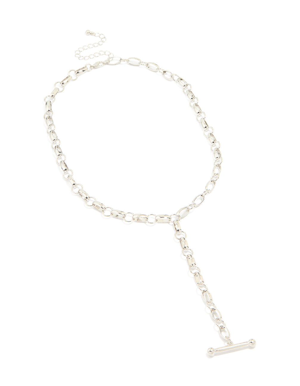 Add a touch of sleek sophistication to your look with this Silver Chain T-Bar Y-Necklace. This stunning necklace features a delicate silver-tone chain with a minimalist T-bar detail that creates a modern Y-shaped silhouette. Perfect for layering or wearing solo, this versatile necklace is ideal for anything from casual daytime outfits to chic evening ensembles. Pair it with a crisp shirt and jeans for a laid-back vibe, or style it with a little black dress for a polished, contemporary finish. Whether you're heading to brunch, a date night, or a party, this silver necklace is a must-have accessory for effortlessly elevating your style.