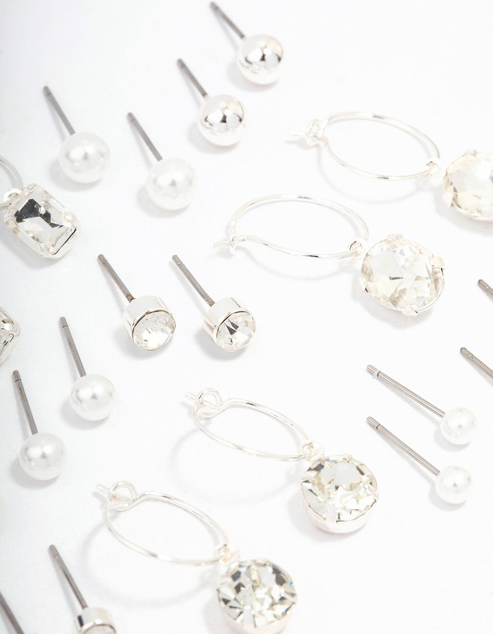 Create the ear stack of your dreams with this pack of silver-toned stud and hoop earrings. This jewellery pack includes twelve pairs of earrings, each adorned with diamantes and round motifs for a timeless touch.