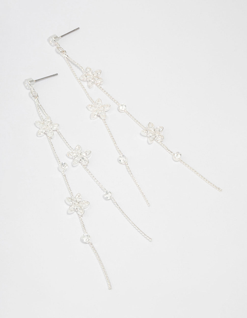 Elevate your outfit with our selection of stunning, cubic zirconia statement earrings. These lovely drop earrings feature two fine strands, adorned with simple flower motifs.