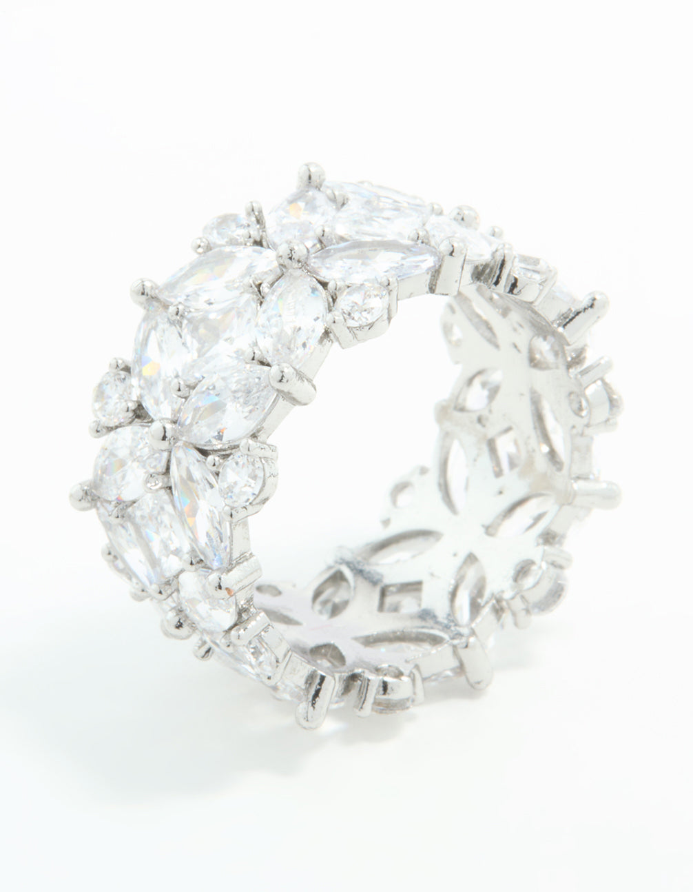 Elevate your accessory game with this stunning Silver Cubic Zirconia Floral Wide Band Ring. This ring combines elegance and charm, featuring a wide band design adorned with delicate floral patterns and sparkling cubic zirconia crystals. The silver-toned finish adds a polished, timeless touch, making it perfect for everyday wear or special occasions. Whether you're dressing up for a fancy dinner or adding some flair to your casual outfit, this wide band ring is a versatile choice. Pair it with flowy dresses for a romantic vibe or stack it with simpler rings for a bold, layered look. A gorgeous addition to your jewellery collection, this floral ring is ideal for anyone who loves blending sophistication with a youthful, playful edge!