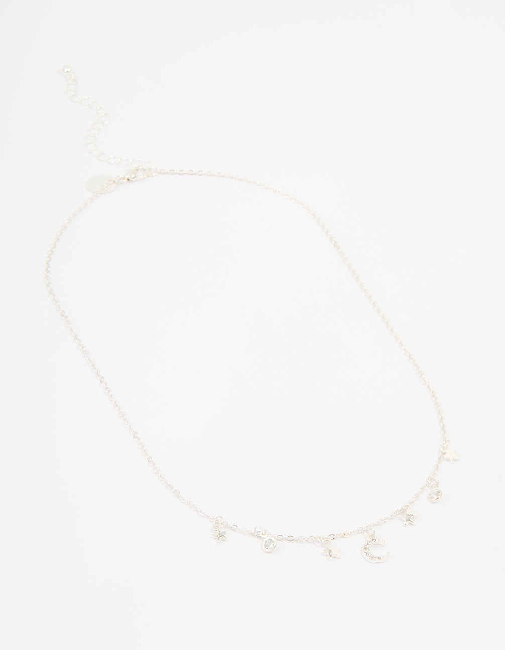 Shine bright with this Silver Diamante Celestial Charm Necklace. Featuring a sleek silver-tone finish and dazzling diamantes, this celestial-inspired jewellery piece is perfect for anyone who loves starry vibes. Its delicate celestial charm motif design makes it ideal for layering with other necklaces or wearing solo for a chic statement. Pair it with a flowy dress for a night out, or add it to your casual look of jeans and a tee for an effortlessly stylish touch. Whether you're heading to a party, brunch, or just want to elevate your everyday style, this silver necklace is your go-to for a little extra shine. A must-have accessory for jewellery lovers!