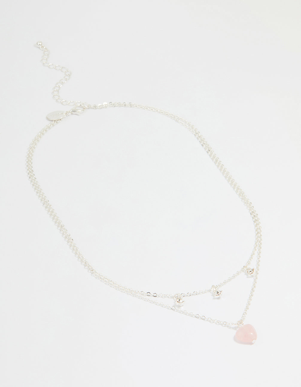 Silver Diamante & Pink Stone Heart Layered Necklace