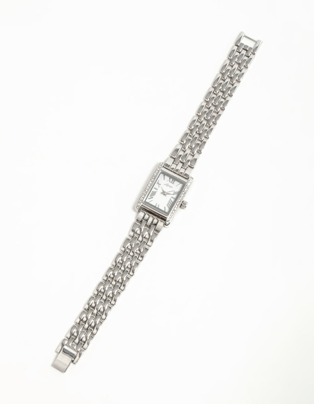 Silver Diamante Roman Numeral Enamel Rectangle Watch