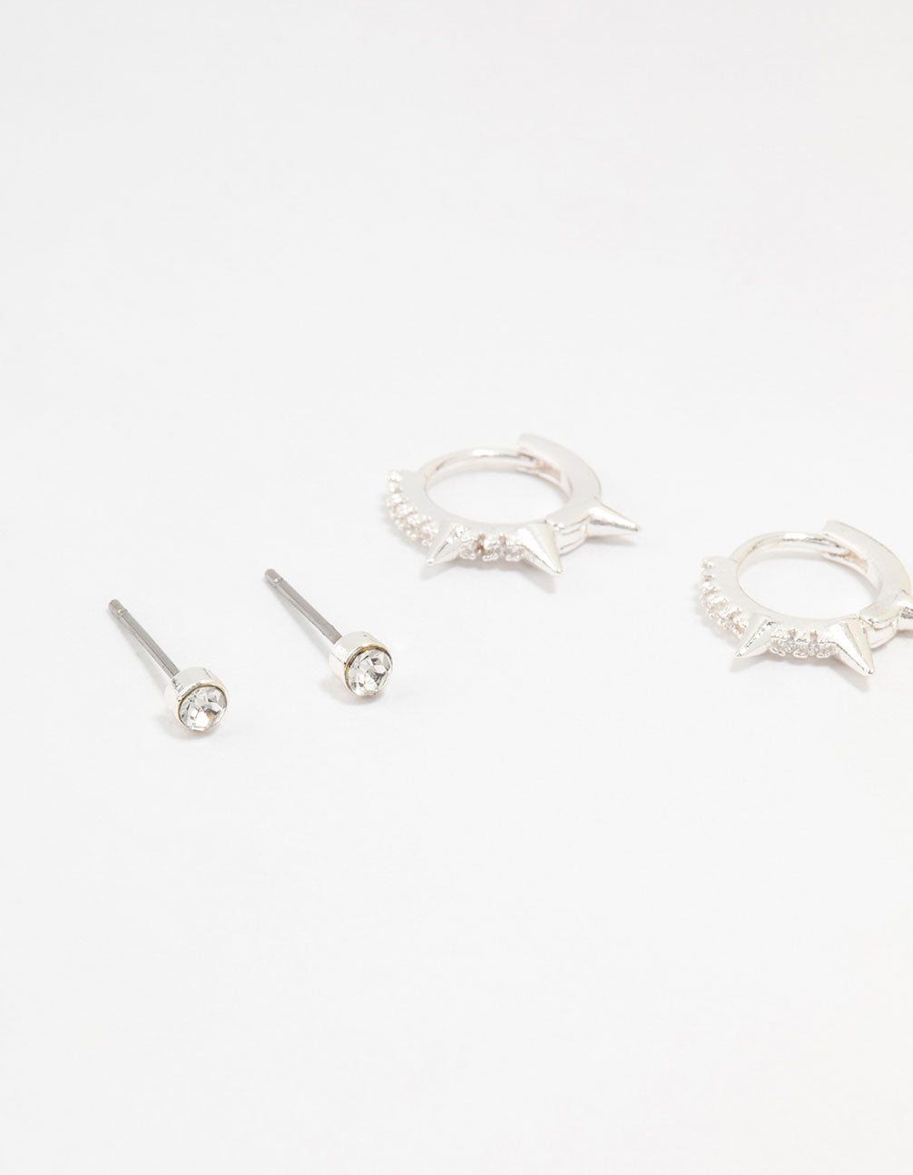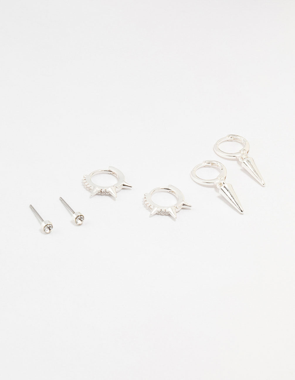 Be spoiled for choice with this striking trio of different earrings to fit different moods. This trio includes edgy spikey hoops, hoops with a drop spike design and small sparkly diamante studs. Perfect for curating an effortlessly cool ear stack.