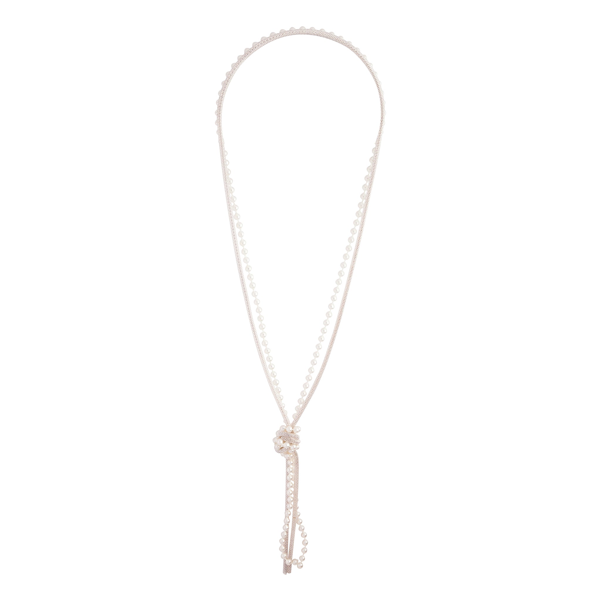 Stand out in this stunning pearlised bead and silver mesh row necklace.