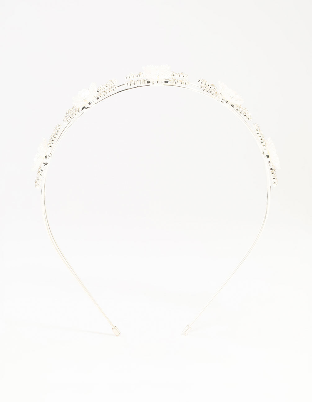 Enhance your special day with this elegant headband featuring a silver-toned base and a double design of mini crystal flowers. It's perfect for adding a subtle yet beautiful touch.