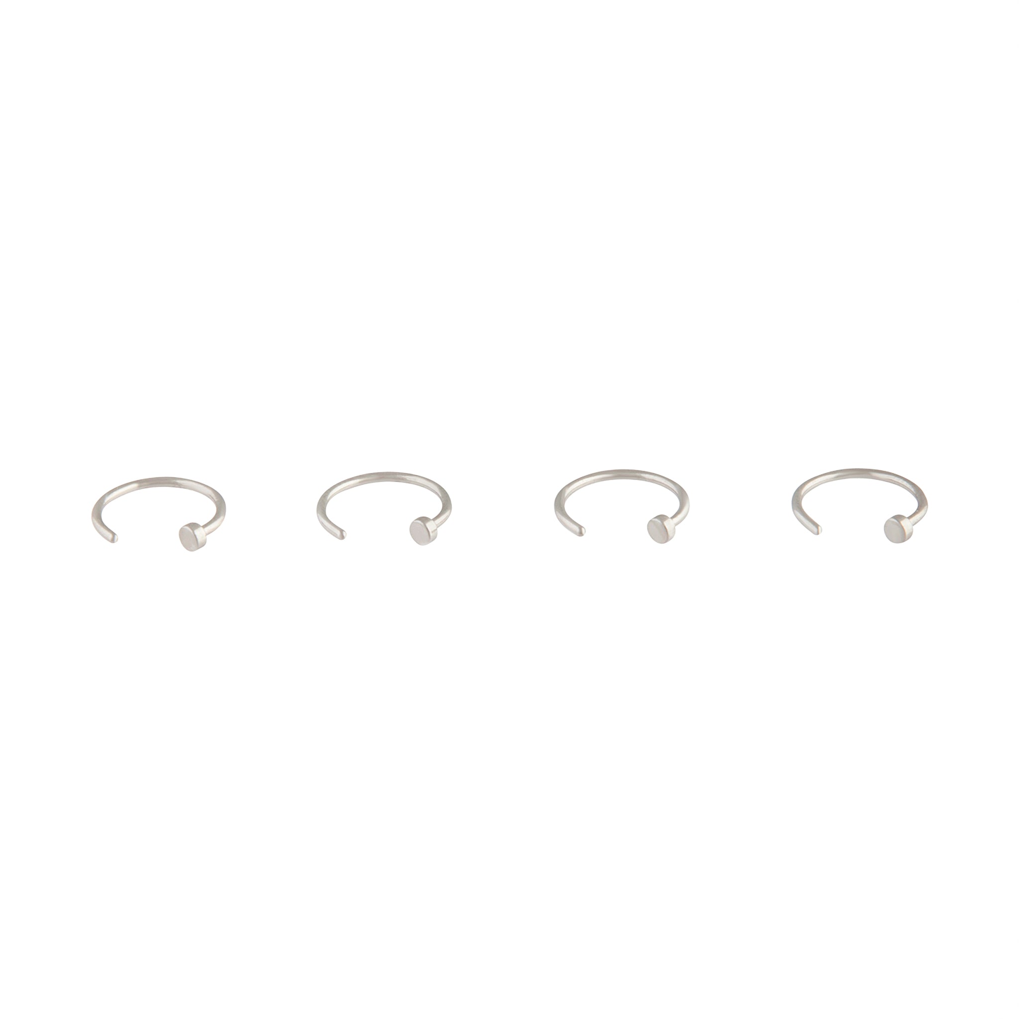 Lovisa body jewellery is made from surgical steel, making it the perfect option for everyday wear. This collection has been made with piercings in mind and features both trend-led and classic styles that you can swap out to suit any occasion. This pack comes with four silver-toned nose rings in a nail design. Mix and match your nose rings to coordinate with Lovisa accessories for a fashion-forward look!