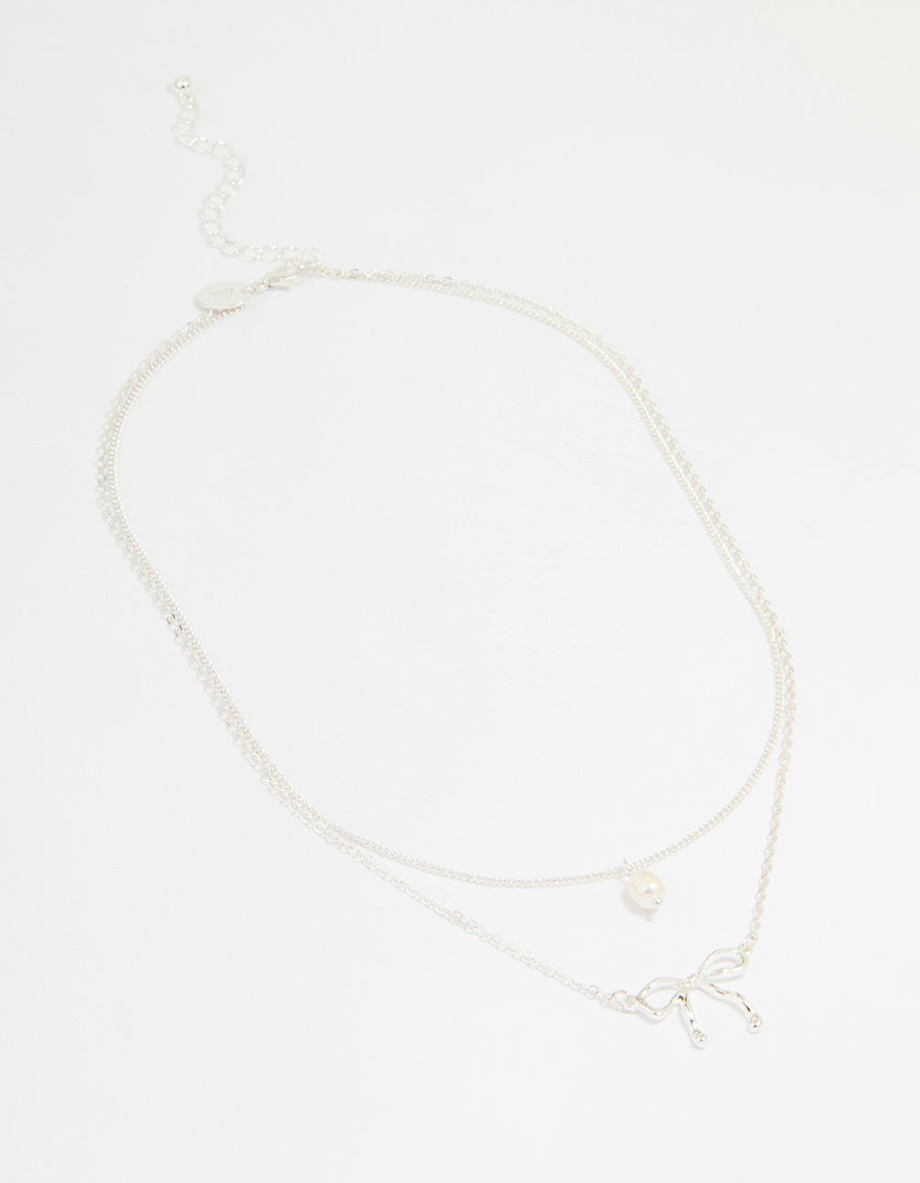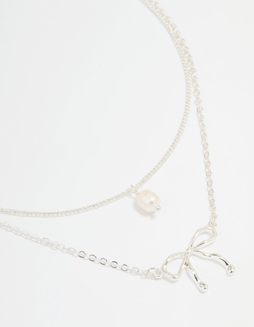 Add a touch of charm to your jewellery collection with this Silver Pearl & Bow Layered Necklace. This beautifully crafted layered necklace combines sleek silver tones with delicate pearl accents and a dainty bow design, creating a timeless yet playful piece. Perfect for layering or wearing on its own, this necklace is a versatile accessory that works for casual days out or dressier occasions. Pair it with a flowy dress for an elegant look or with a simple blouse and jeans to elevate your everyday style. Whether you're heading to a brunch date, a party, or even the office, this pendant-style layered necklace is the ideal finishing touch for your outfit.