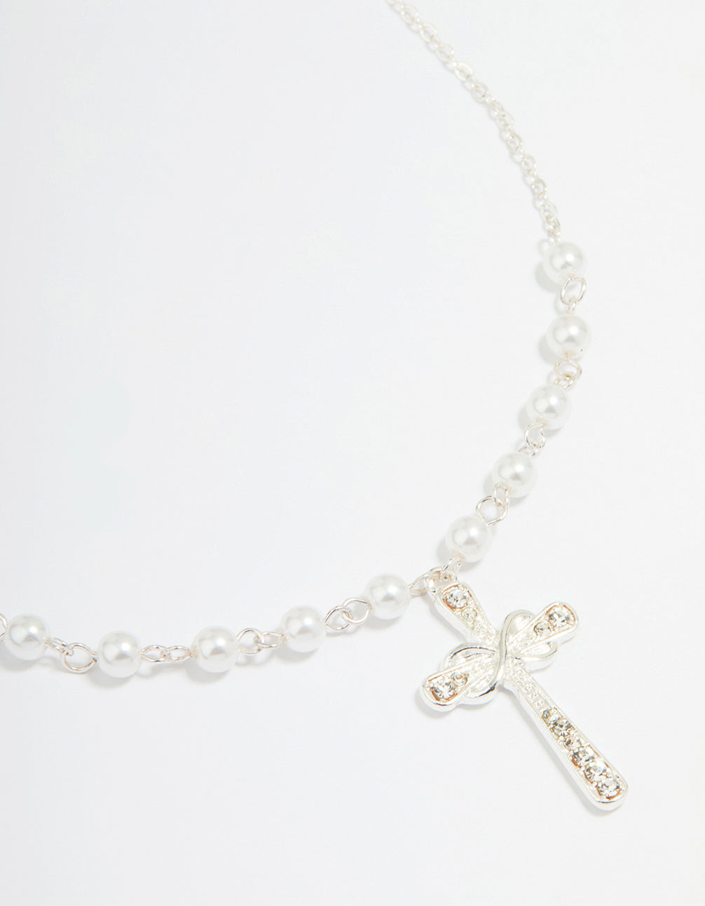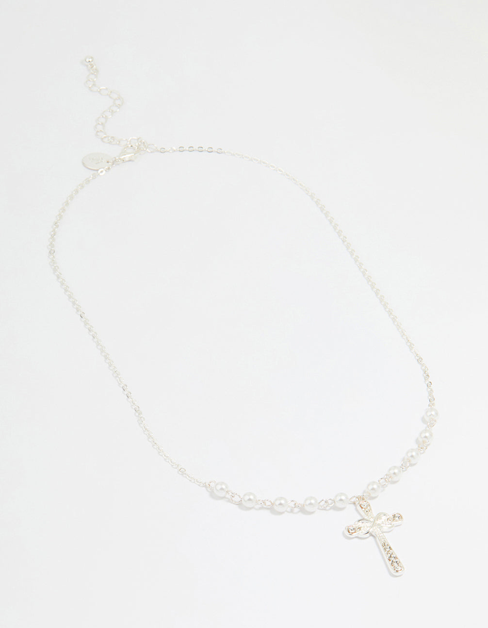 Add a touch of charm to your look with this Silver Pearl Diamante Cross Pendant Necklace. Featuring a sleek silver chain paired with a delicate cross pendant adorned with shimmering diamantes and lustrous pearl detailing , this pendant necklace is the perfect blend of elegance and style. Ideal for layering with other silver jewellery or wearing solo for a minimalist vibe, it's a versatile piece that works for both casual daywear and dressy evenings. Pair it with a flowy blouse, your favourite jeans, or a chic cocktail dress for a polished finish. Whether you're heading out for brunch or a night out, this timeless silver necklace is sure to elevate any outfit.