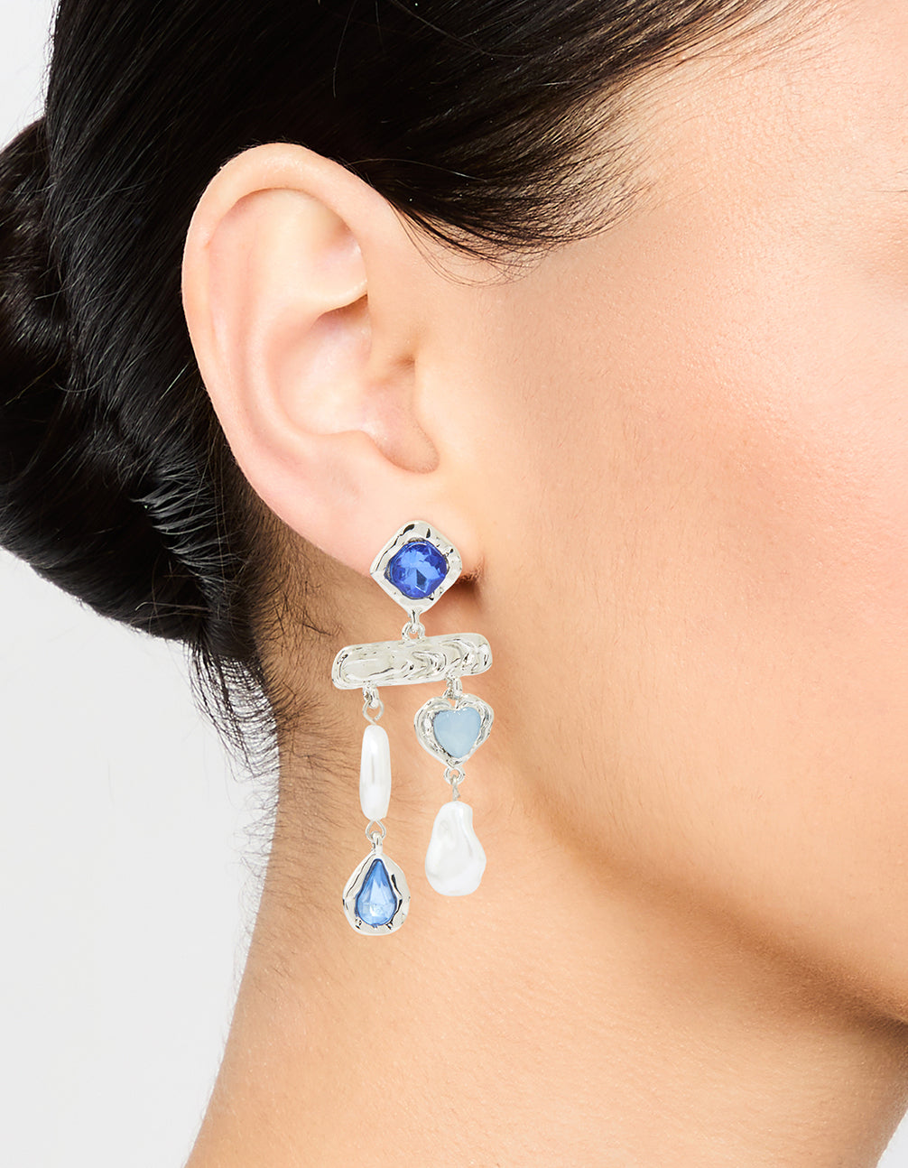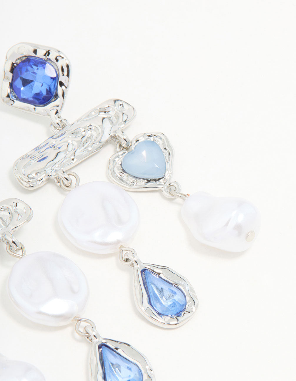 Silver Pearl Molten Blue Diamante Drop Earrings