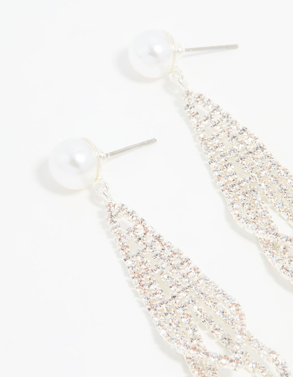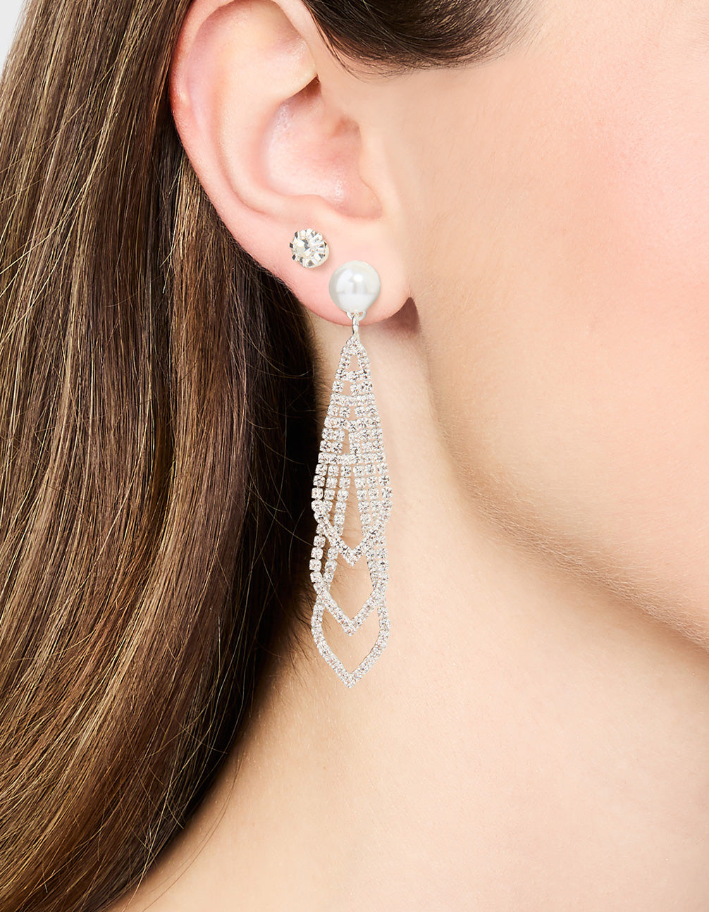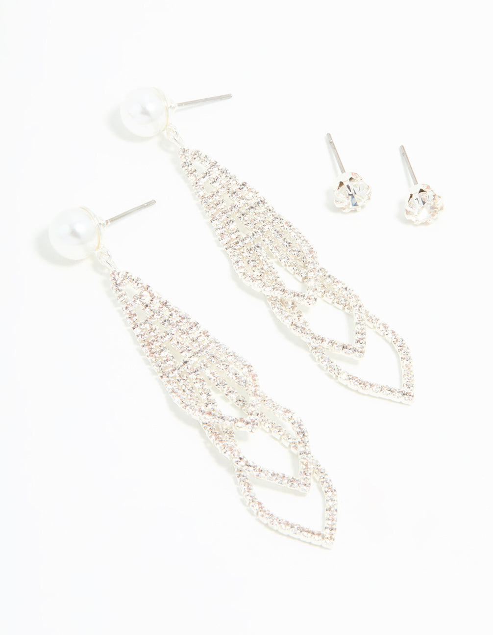 Silver Diamante Pearl Triangular Layered Earrings 2-Pack