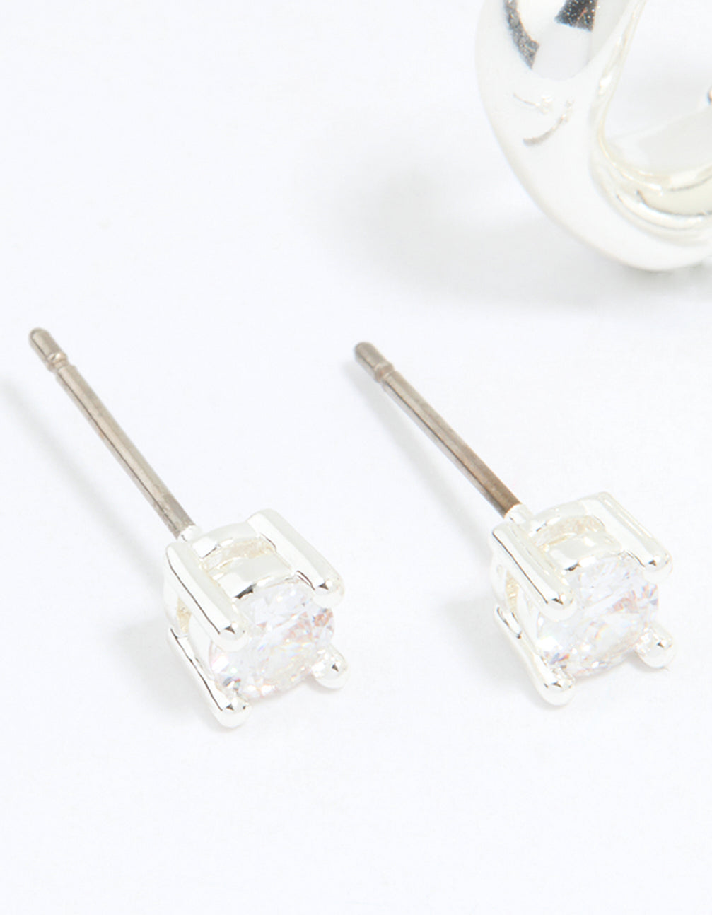 Silver Plated Brass Cubic Zirconia Baguette Hoops & Stud Earrings 4-Pack