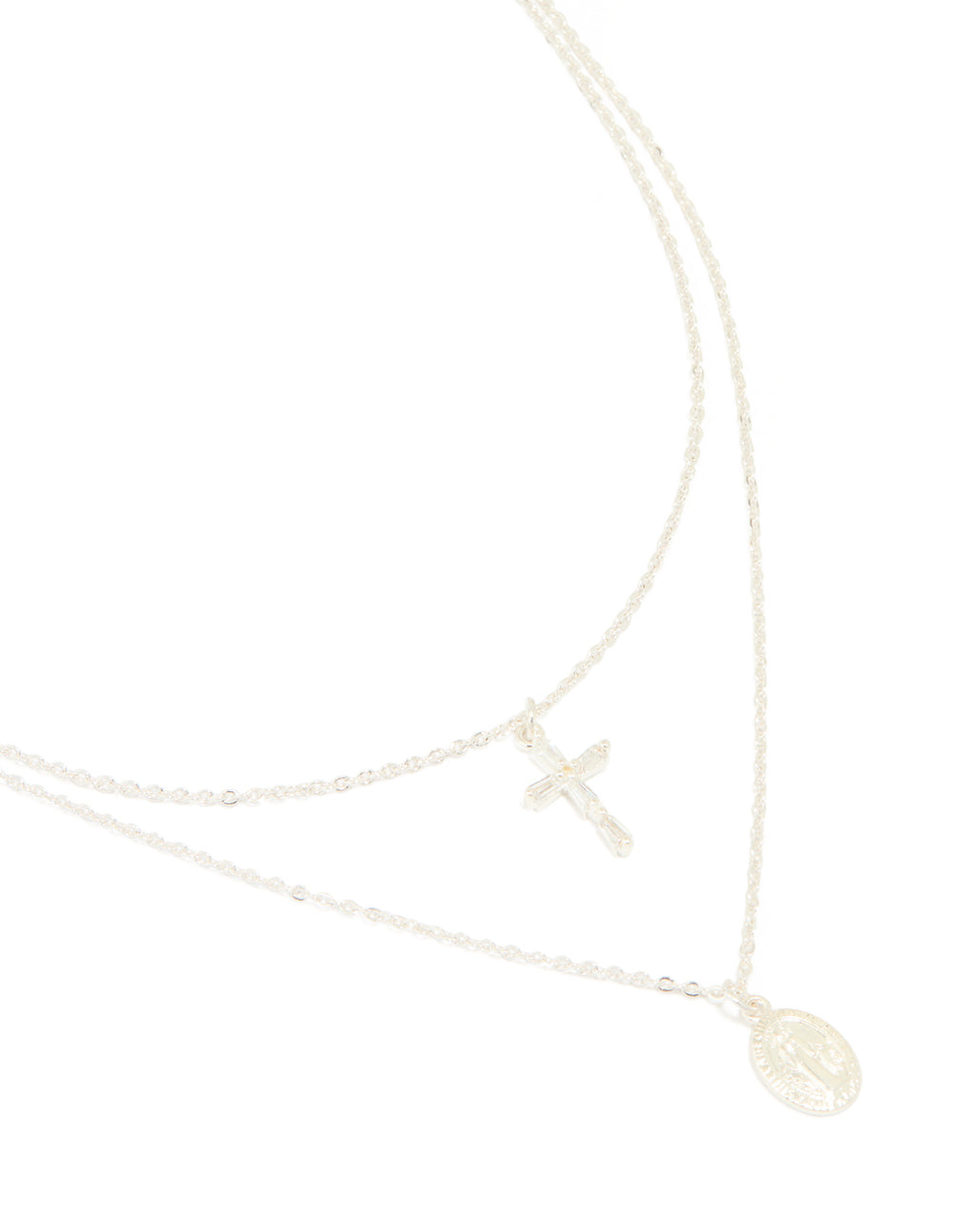 Silver Plated Cross & Mary Pendant Layered Necklace