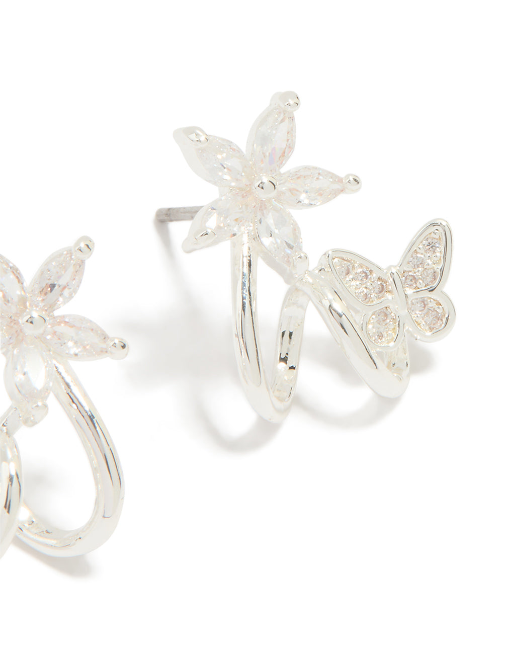 Silver Plated Cubic Zirconia Flower Butterfly Ear Jacket Earrings