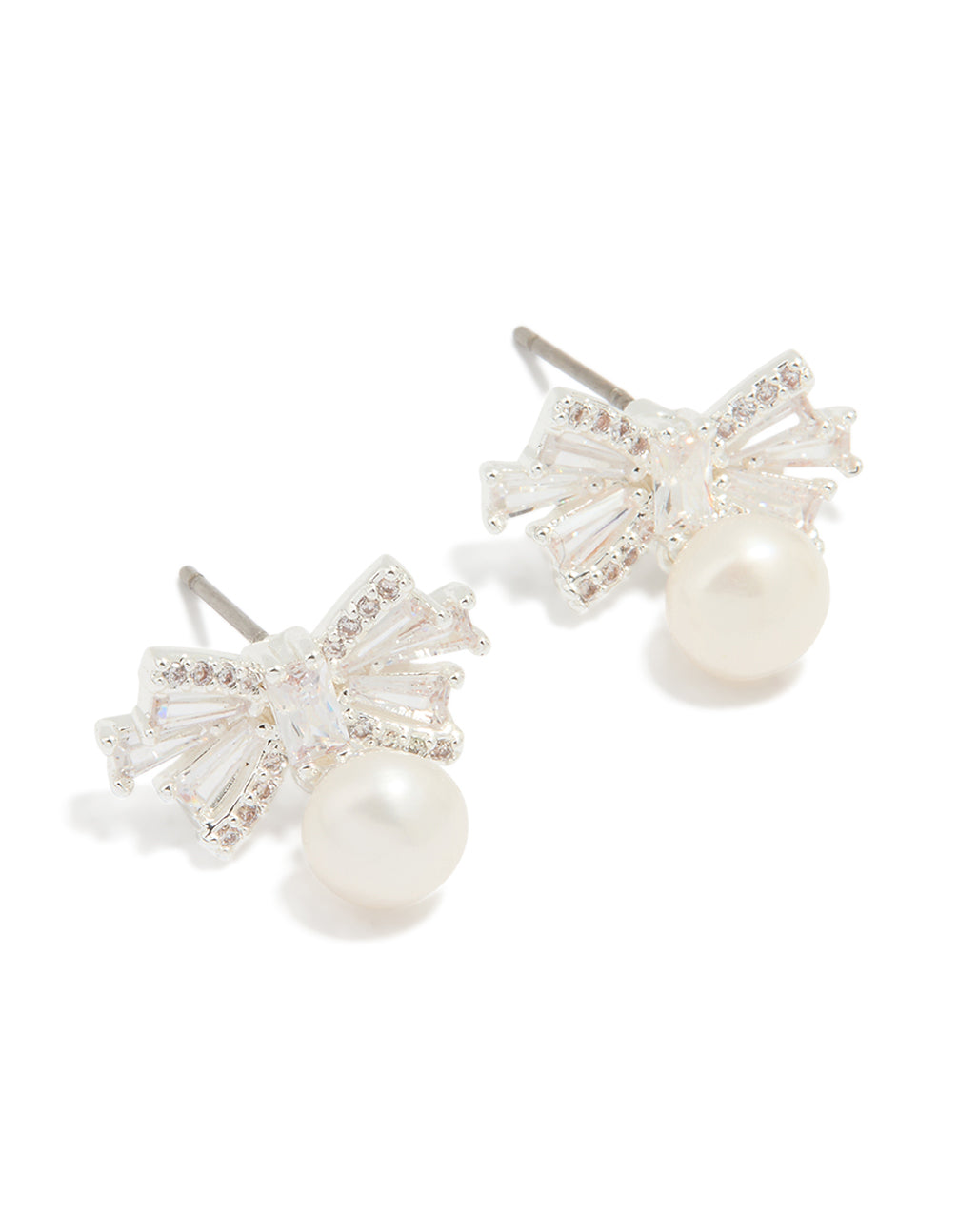 Silver Plated Pearl & Cubic Zirconia Bow Baguette Drop Earrings