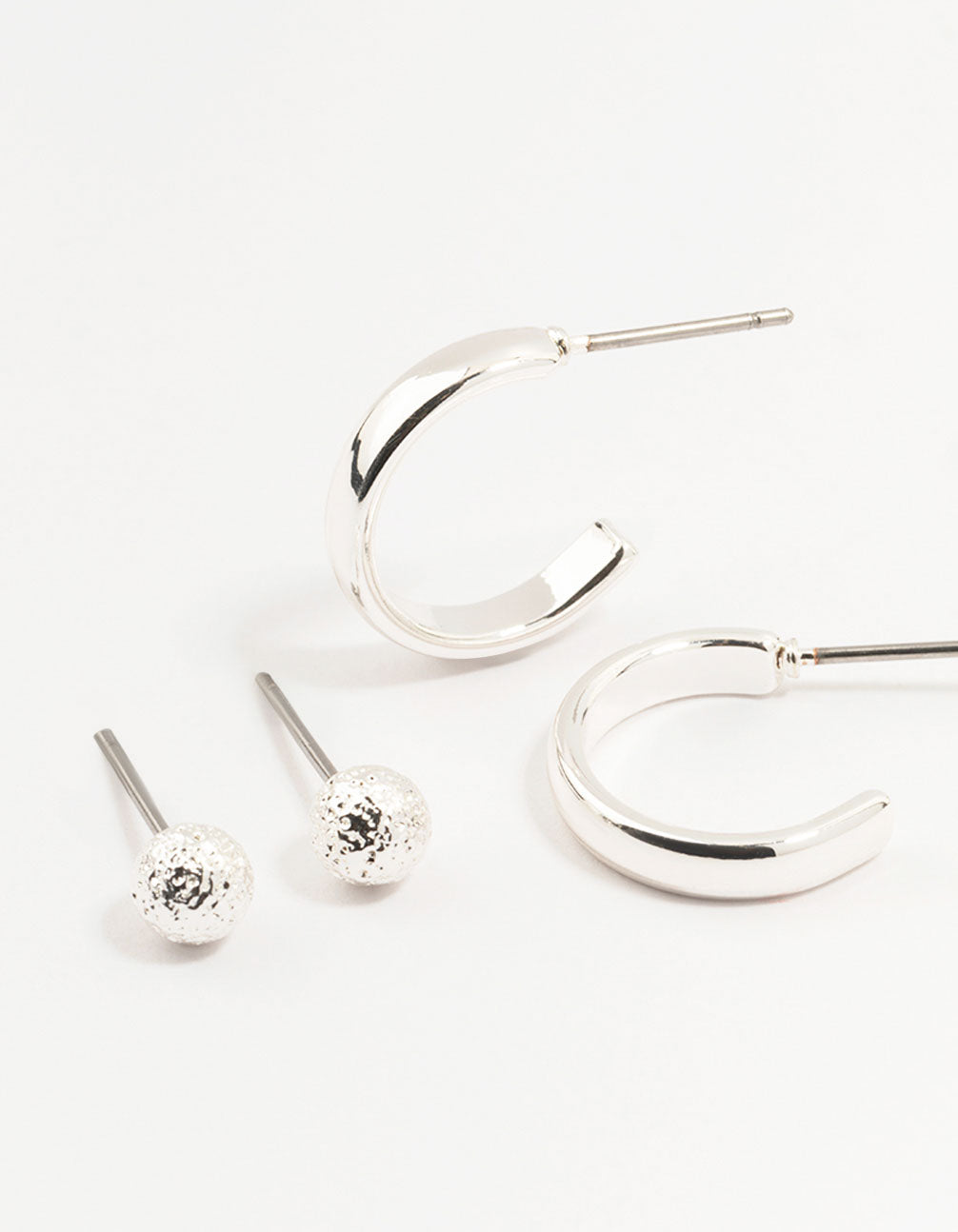 Upgrade your essentials with this trio of 3 stylish Silver pairs, including pearl studs, small hoop earrings, and medium hoop earrings. A versatile set, they are perfect for everyday wear and will complement any outfit.