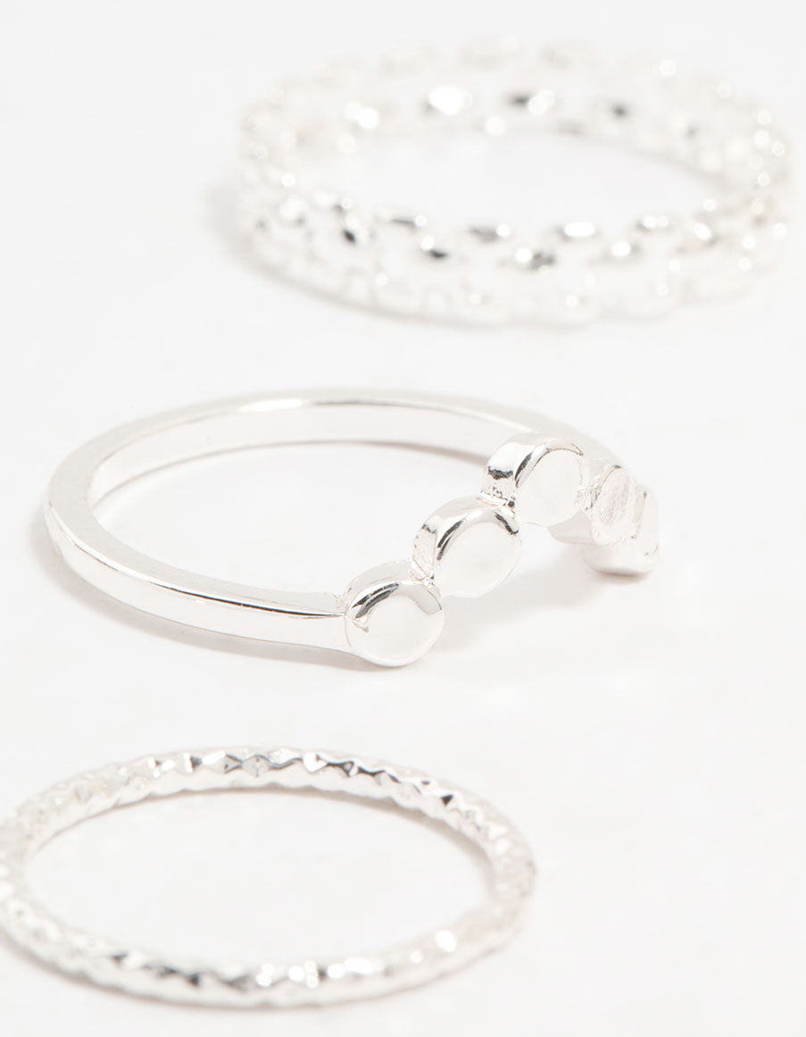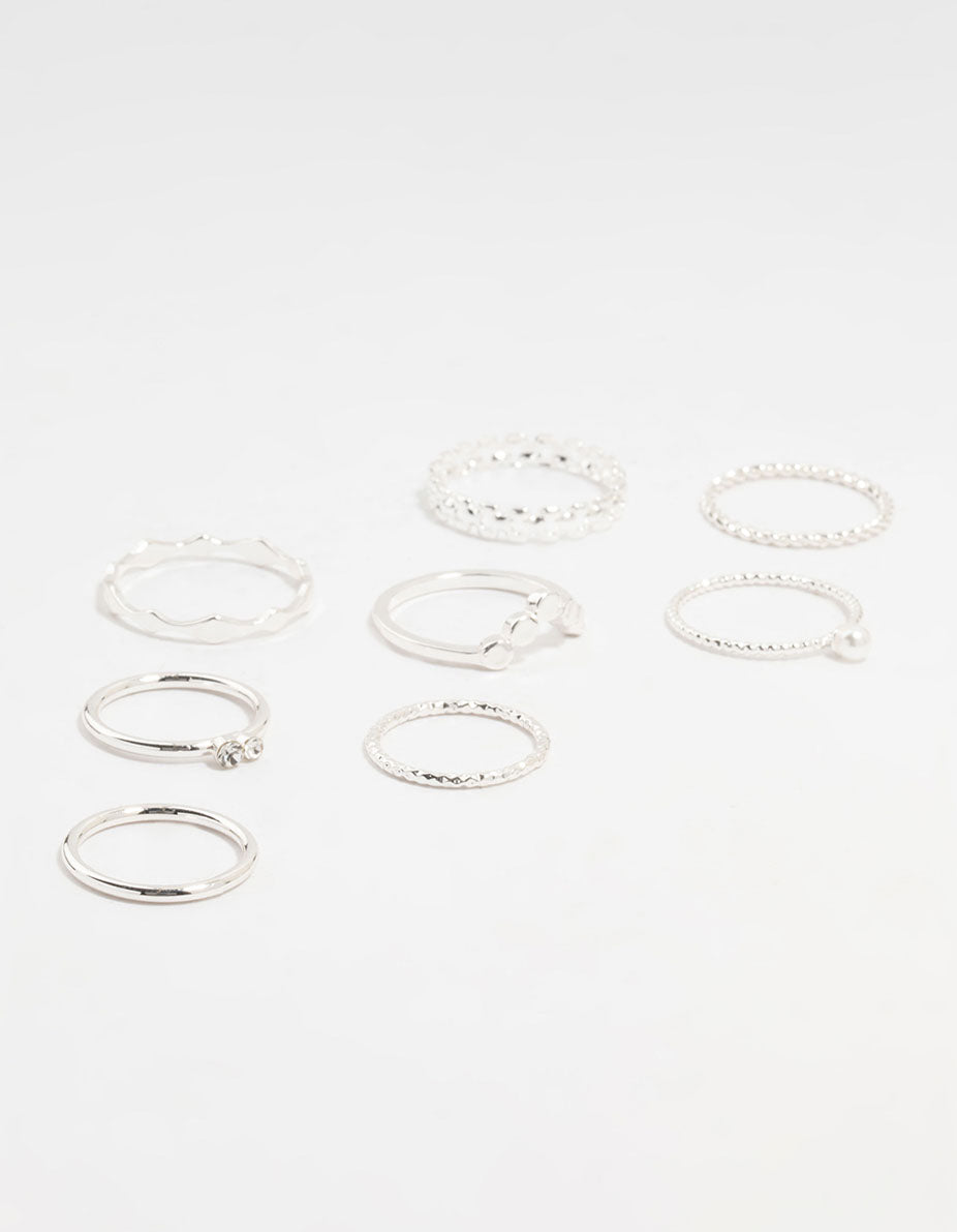 Upgrade your ring game with this stacking ring pack! Featuring 8 silver-toned styles with textures from sleek to twisted, they're perfect for a cool, stylish look.