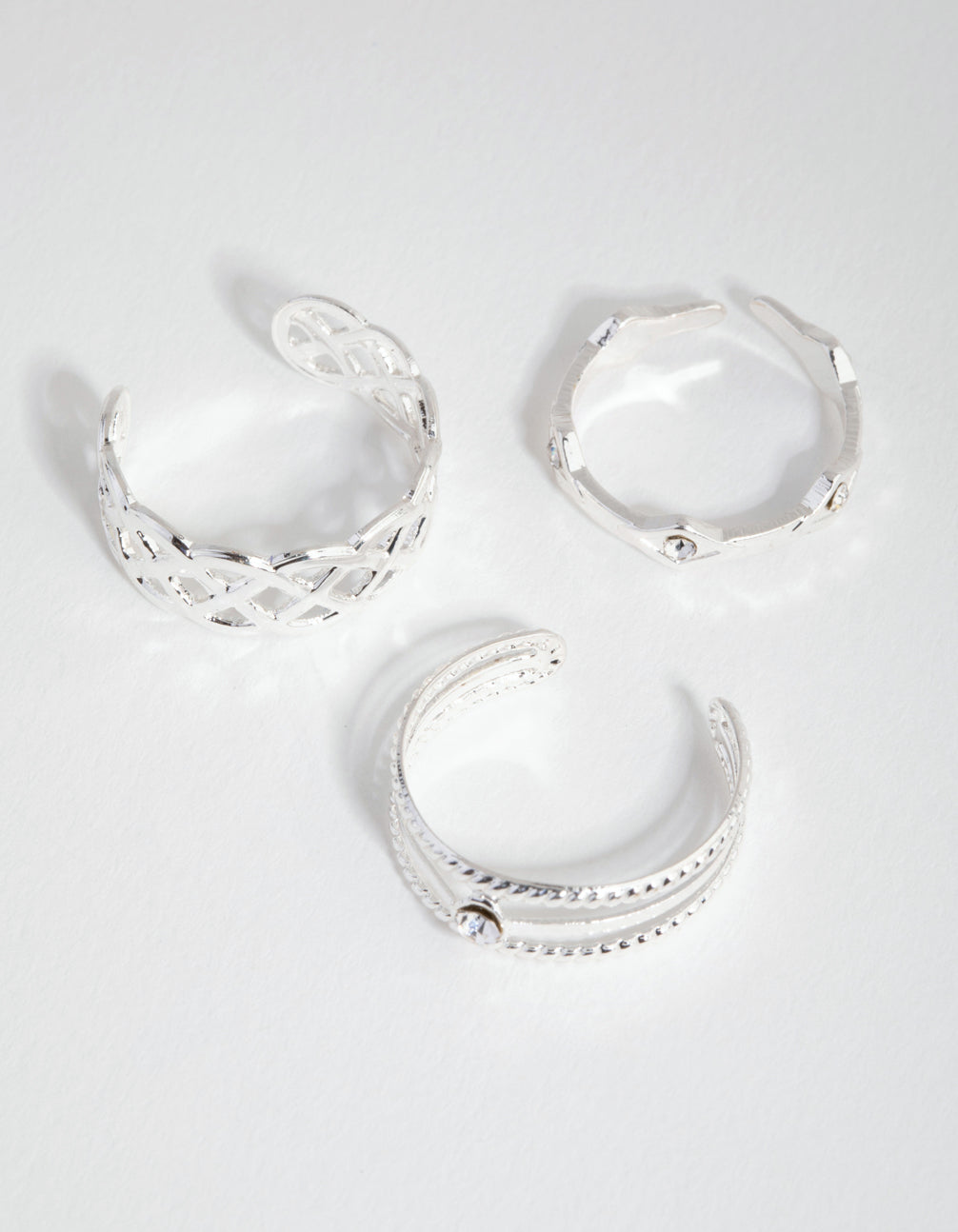 Treat your feet with this toe ring pack! It features three silver-toned rings with different band designs. Stack them all together for maximum impact!