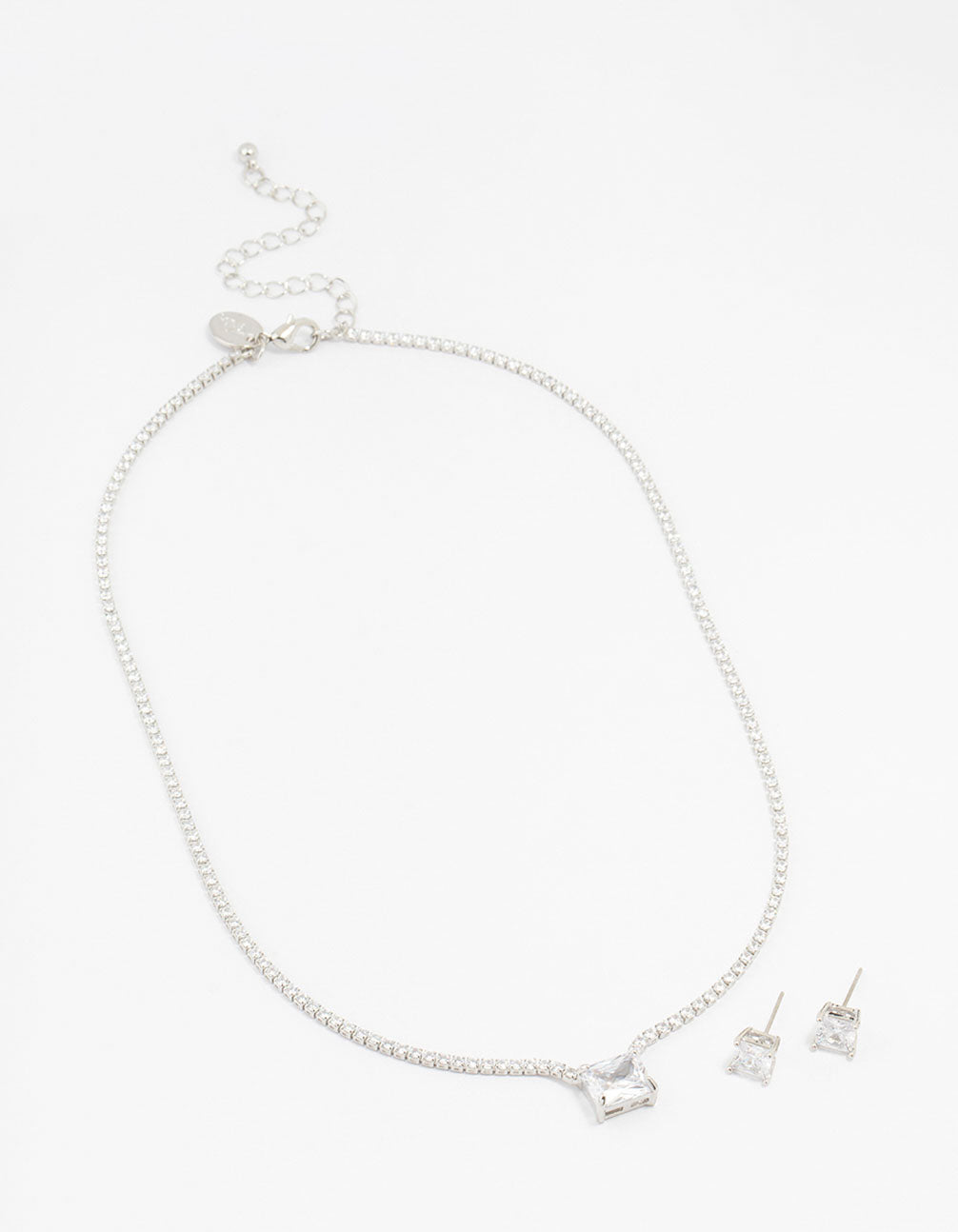 Square Silver Cubic Zirconia Necklace & Stud Earrings Pack