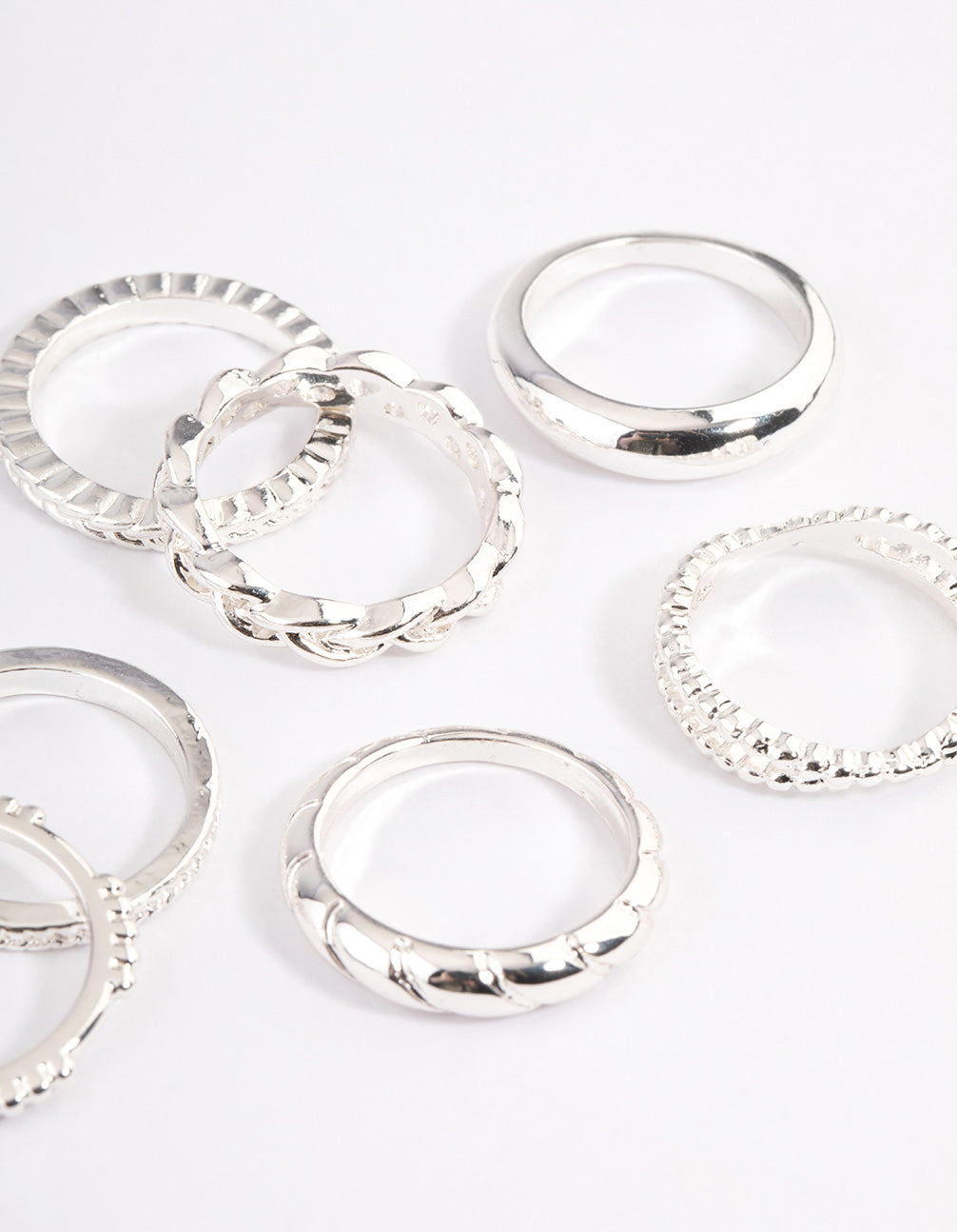 - This ring pack contains eight individual, silver plain and molten twisted rings.