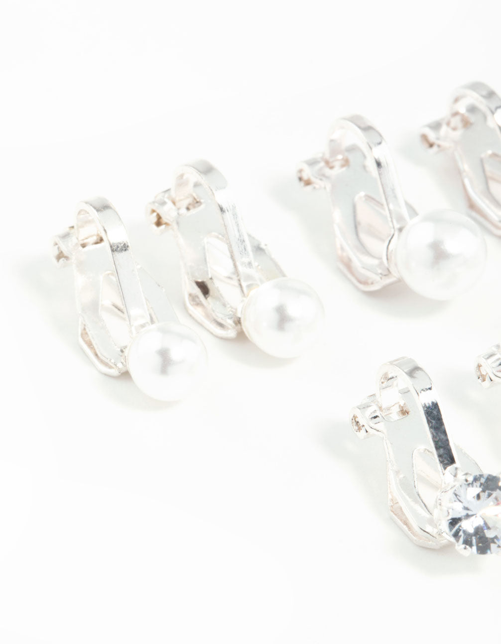 Silver Pearl & Diamante Clip On Earrings 5-Pack
