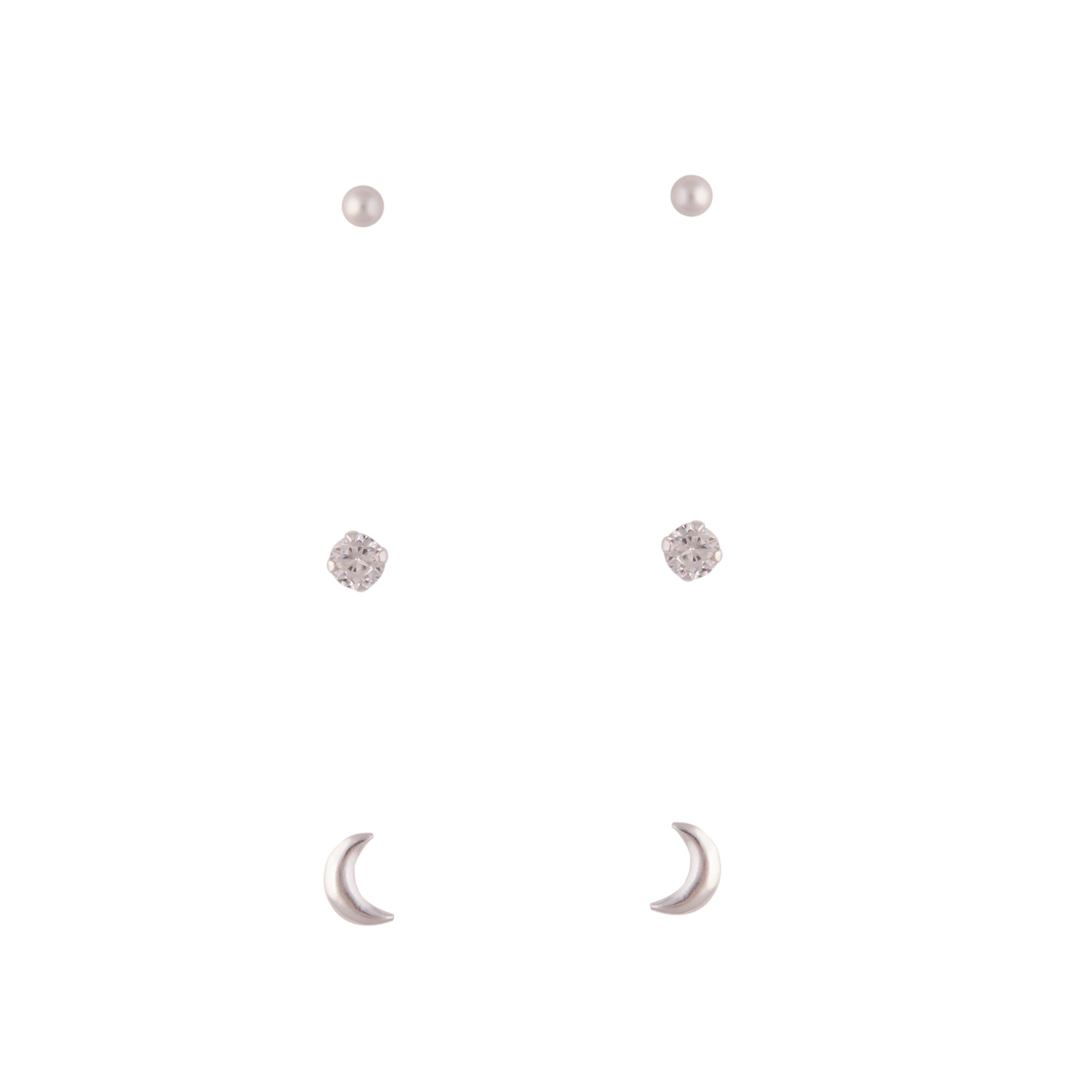 A trio of sterling silver stud earrings with celestial and diamante designs.
