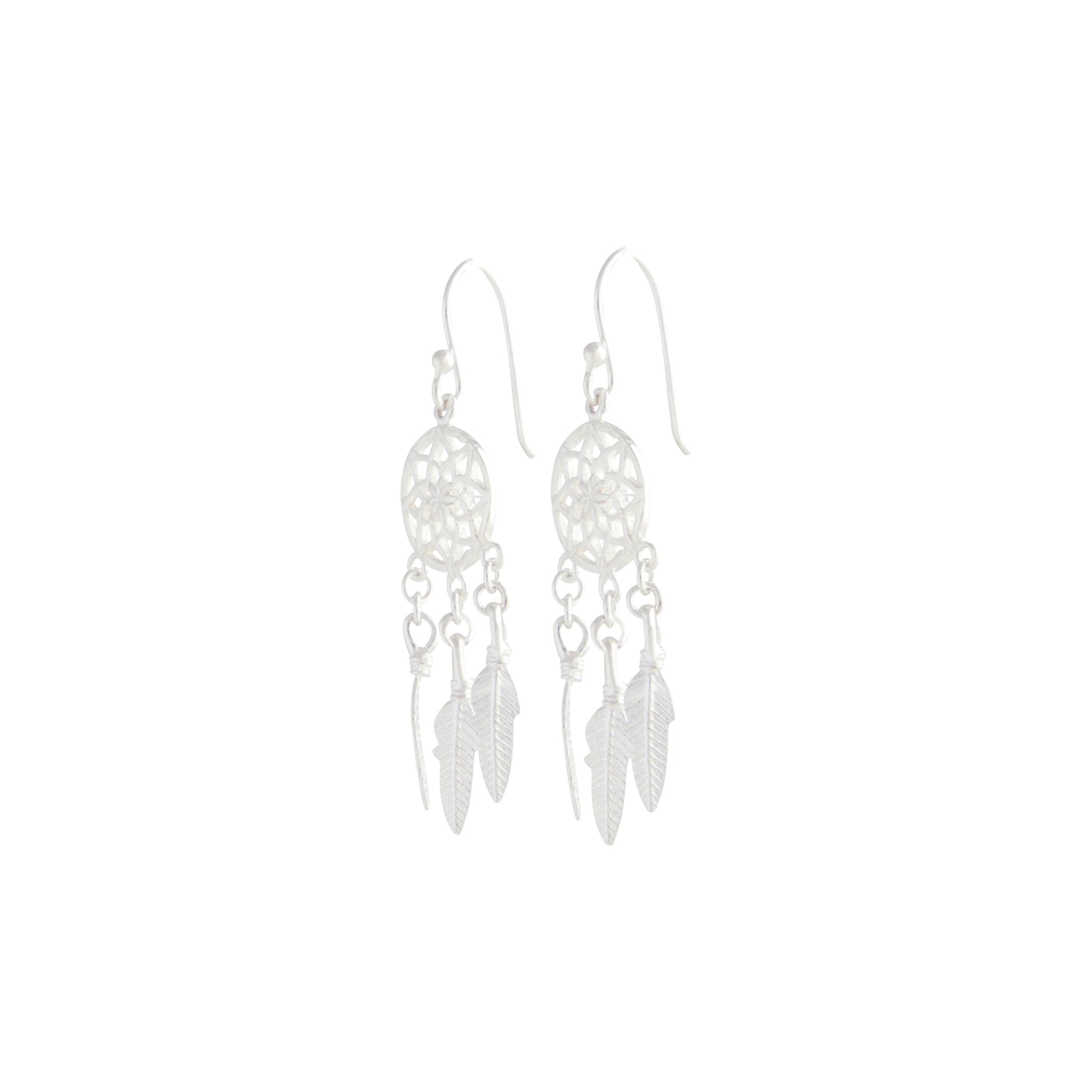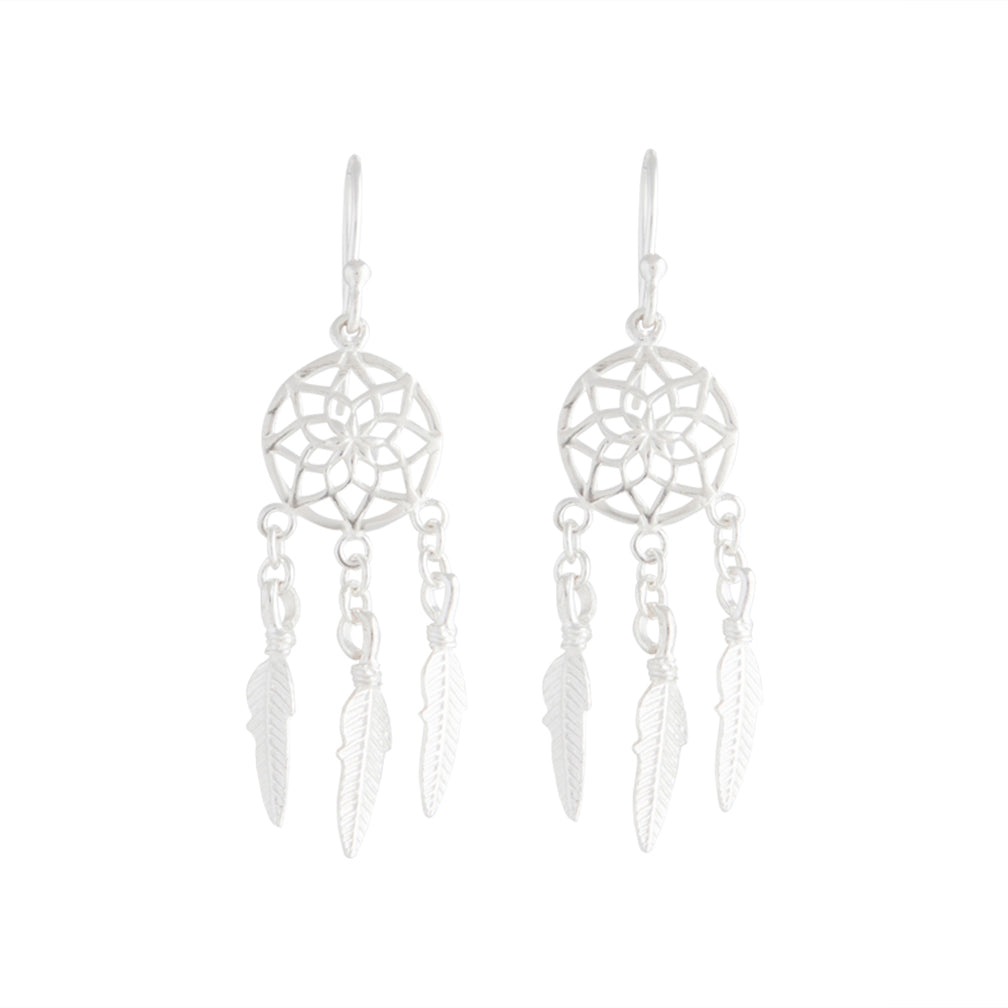 A pair of silver-toned earrings with an intricate dreamcatcher motif.