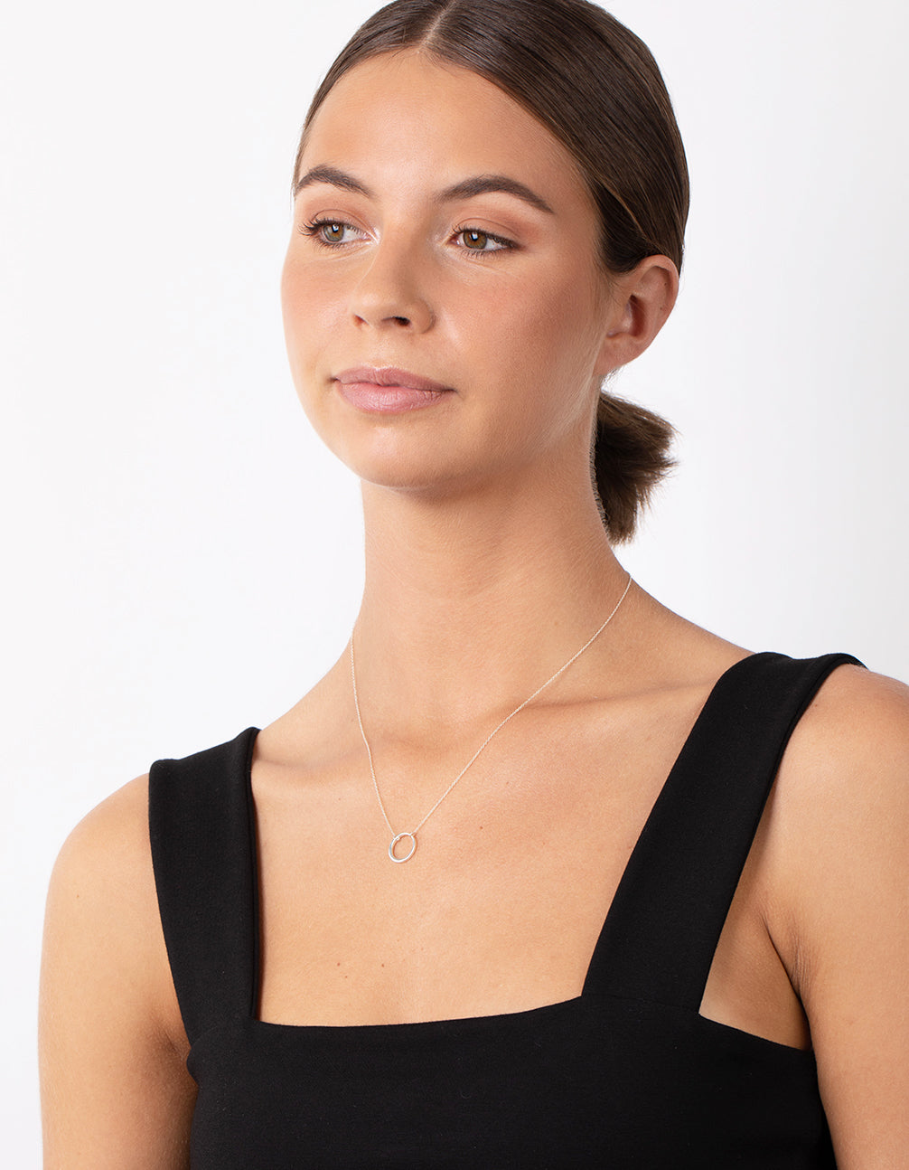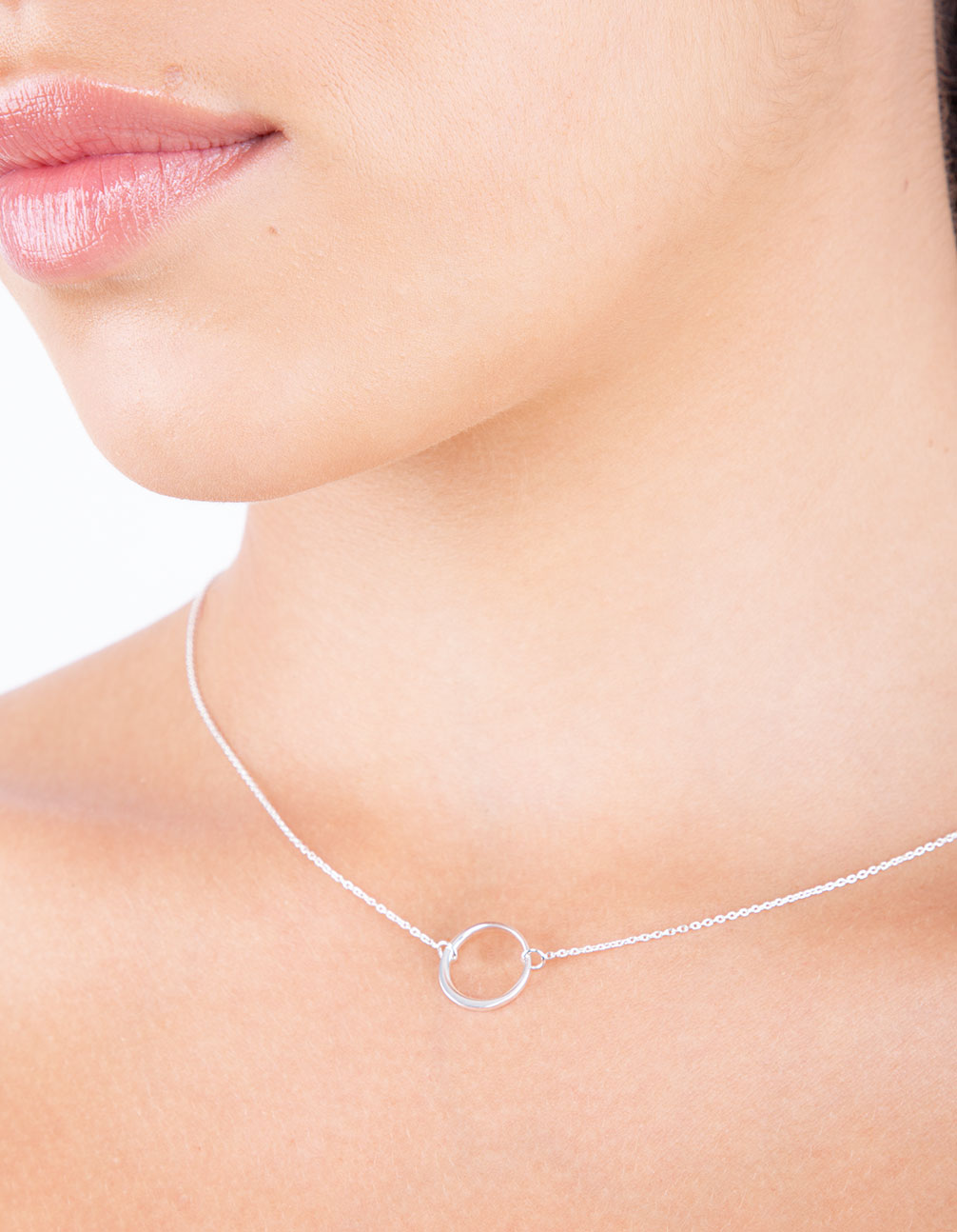 An open circle pendant measuring at 1.3cm on a fine 45cm sterling silver chain.