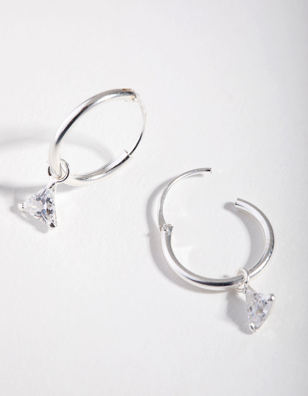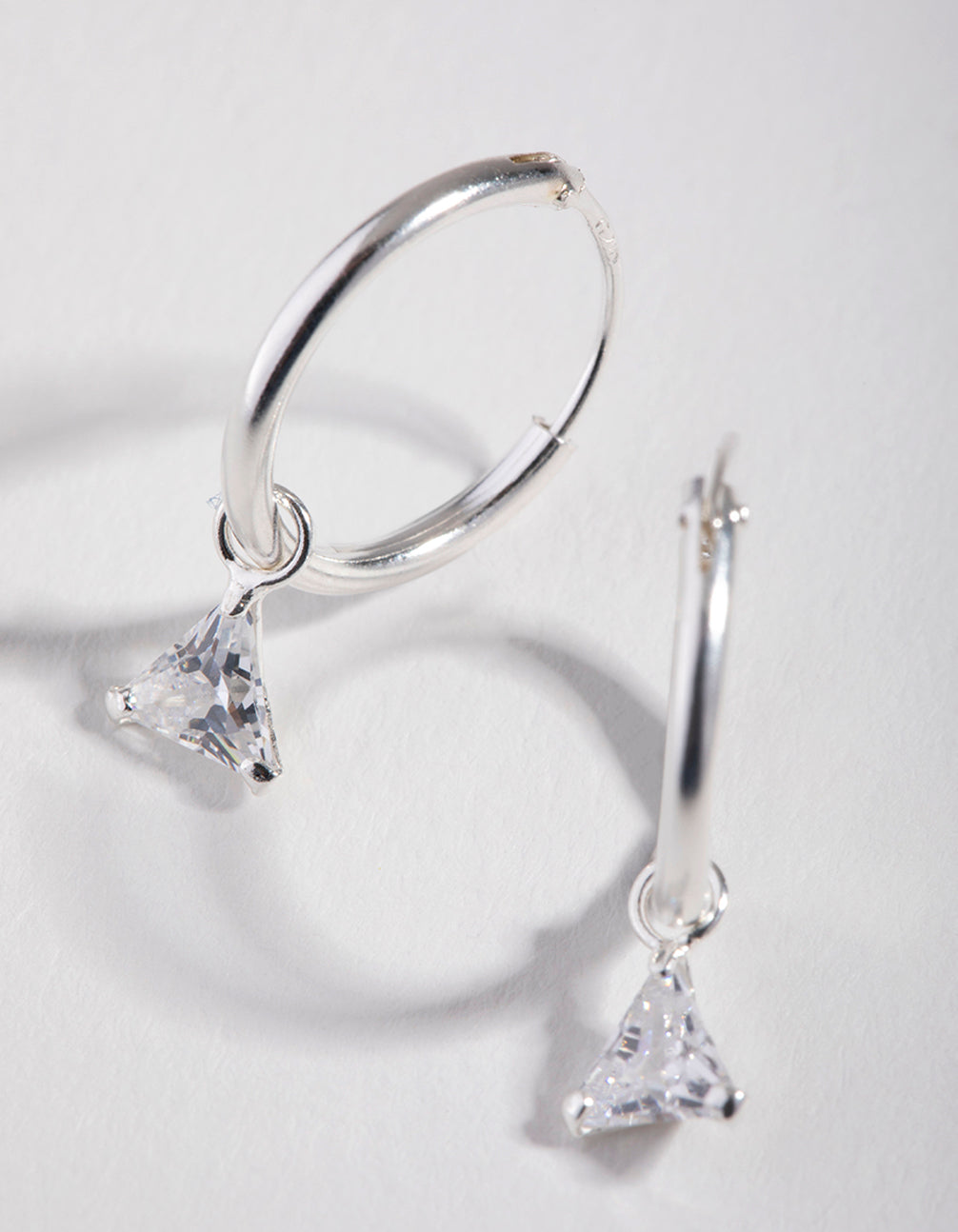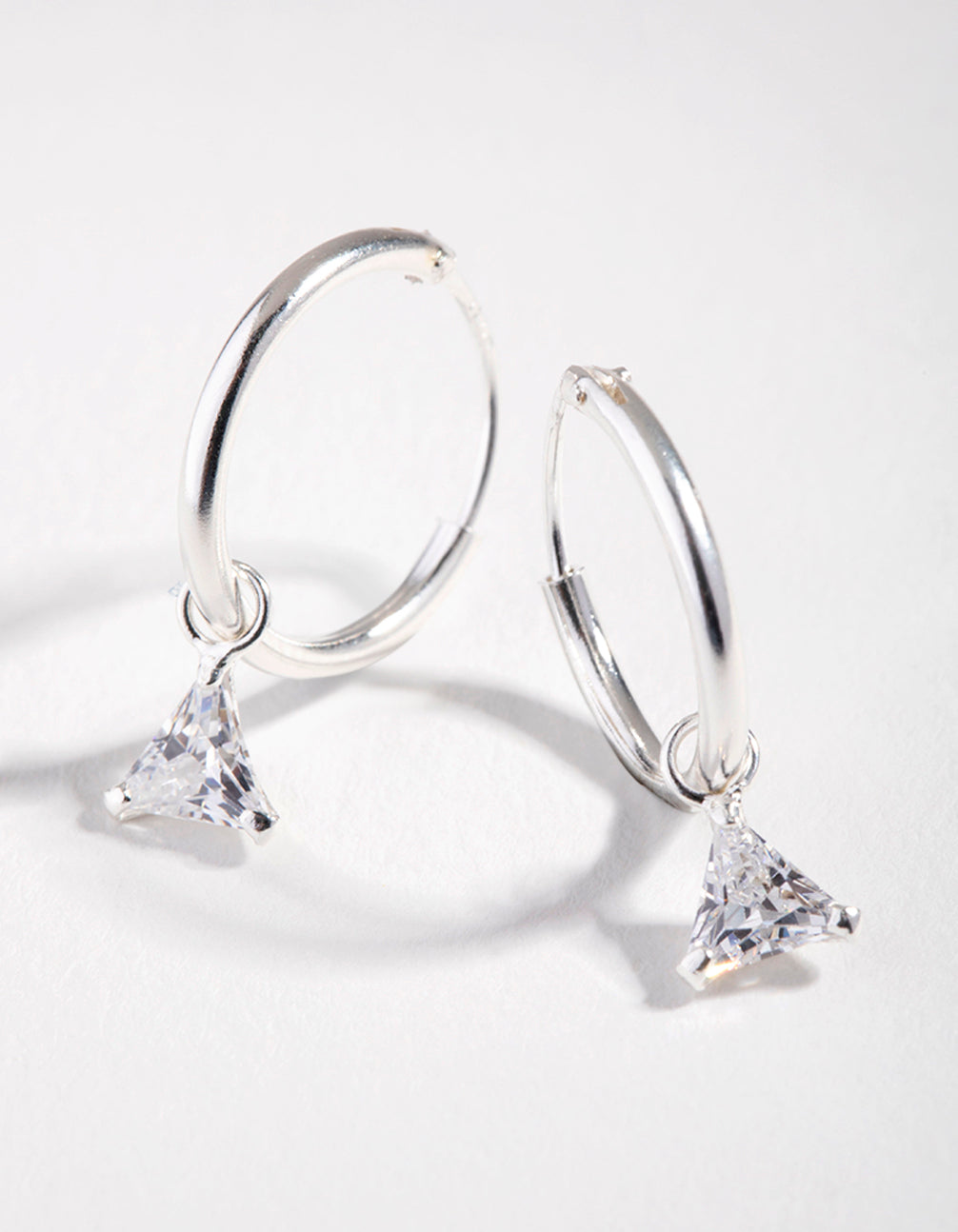 Add a cool edge to your look with these fashion-forward hoops. These earrings are crafted from sterling silver and feature a dangling cubic zirconia triangle for extra sparkle! Layer and stack with other silver-toned pieces for a considered look.