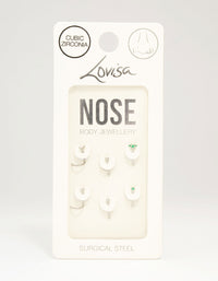 Customise your look with our selection of premium, genuine surgical steel piercing jewellery. This piercing pack contains six individual nose piercings, each adorned with emerald and crystal-coloured diamantes for a touch of glamour.