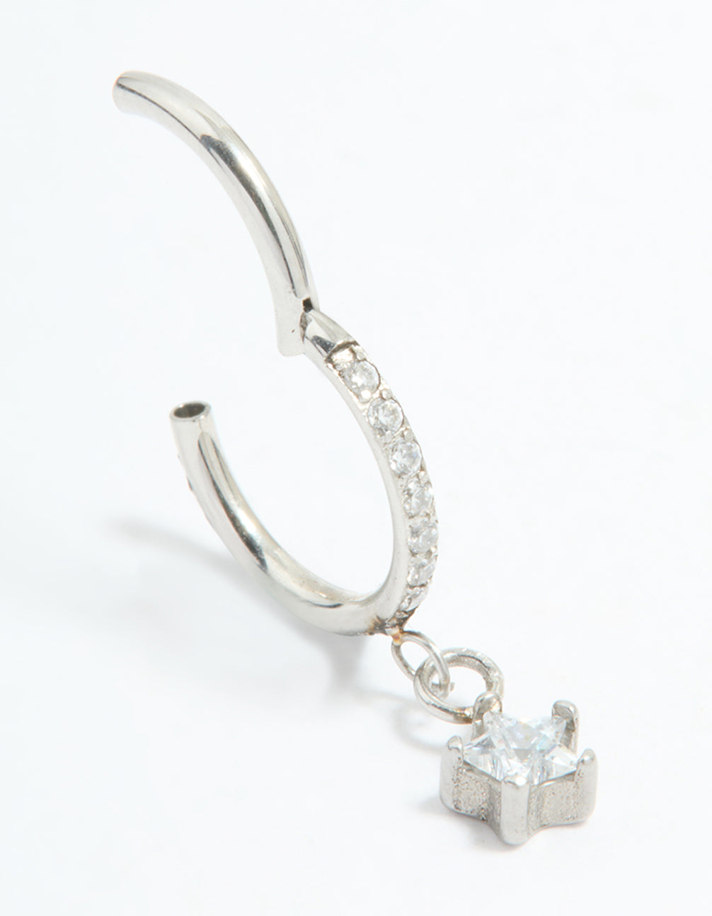 Brighten up your look with this Surgical Steel Cubic Zirconia Micro Star Clicker Ring! Perfect for cartilage piercings, this sleek piece of jewellery combines durable surgical steel with a shimmering row of cubic zirconia crystals and a tiny star-shaped cubic zirconia crystal drop for a playful yet elegant vibe. Whether you're after a helix ring, tragus jewellery, or a dainty earring alternative, this clicker is designed to fit comfortably and securely. The star design adds a touch of glamour that's ideal for dressing up your everyday outfits or pairing with your favourite eveningwear. Wear it solo for understated charm or stack it with hoops and studs for a bold ear party. Stylish, versatile, and easy to wear—this micro star clicker is destined to be your new go-to accessory!