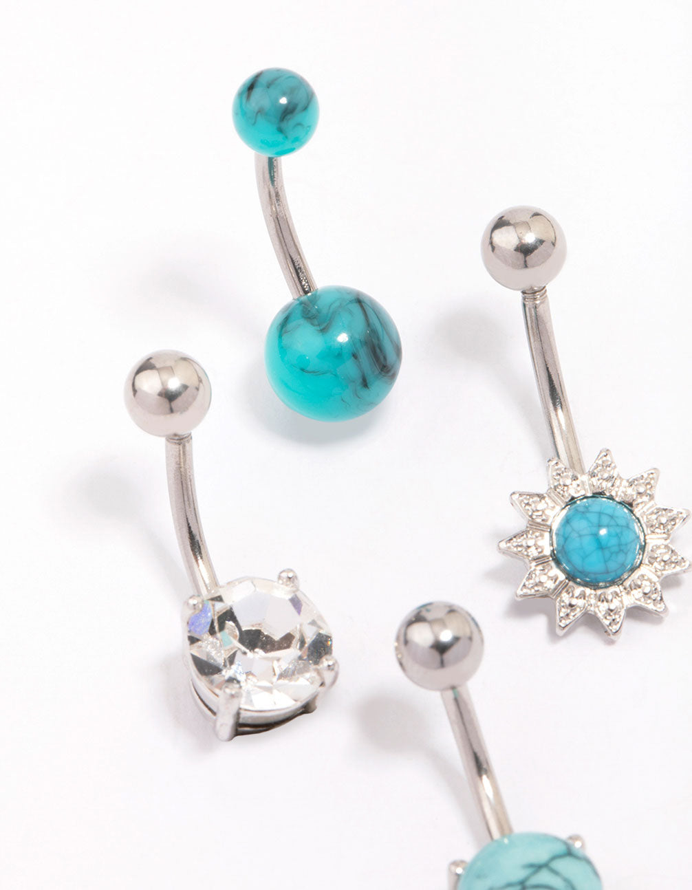 This pack of four belly piercing includes a selection of light blue accents, including stones, sun and ball motifs.