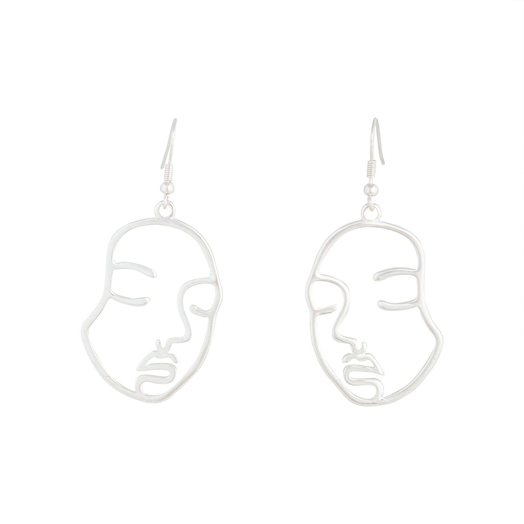 A pair of fine silver toned earrings with an intricate cut-out face design.